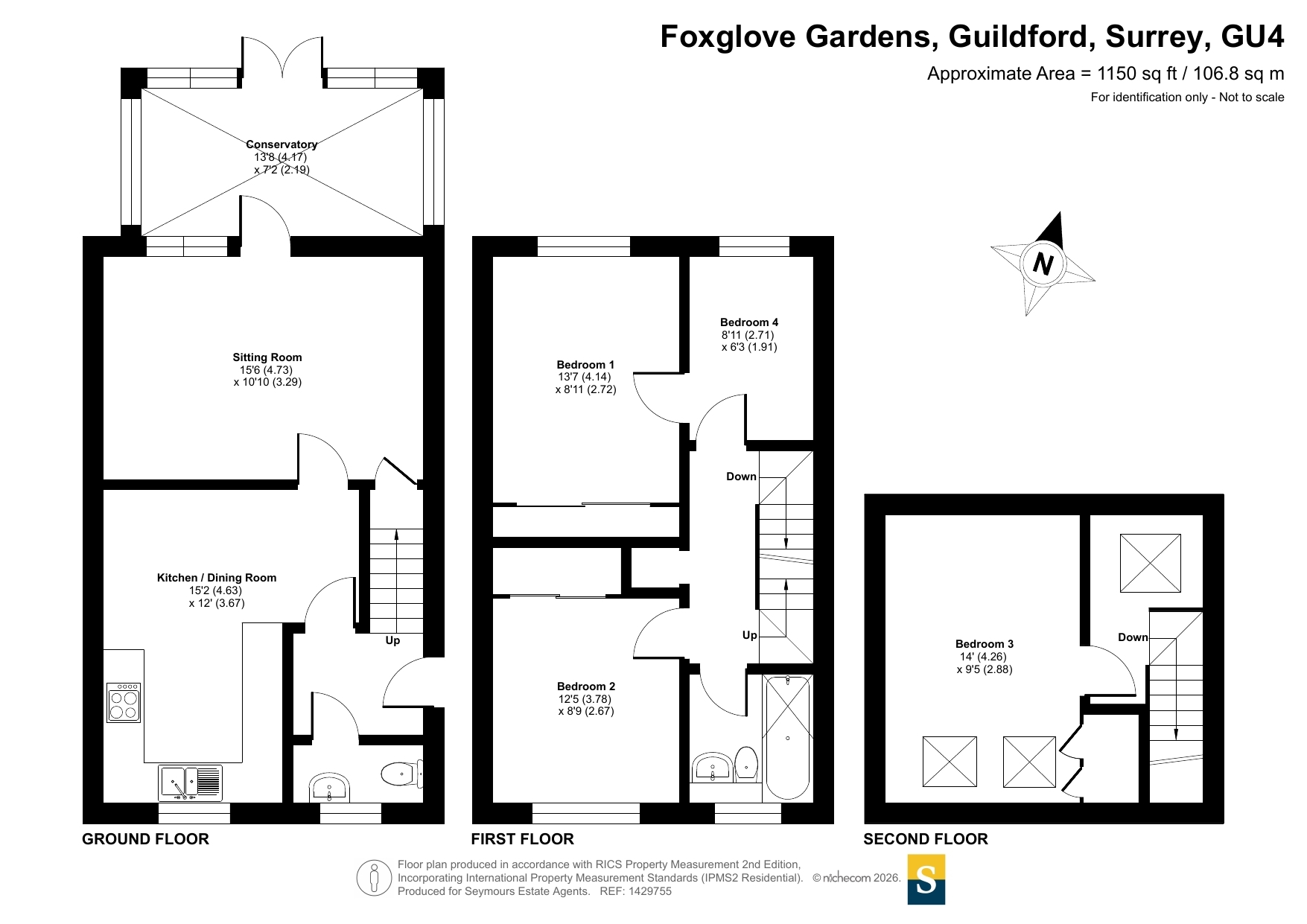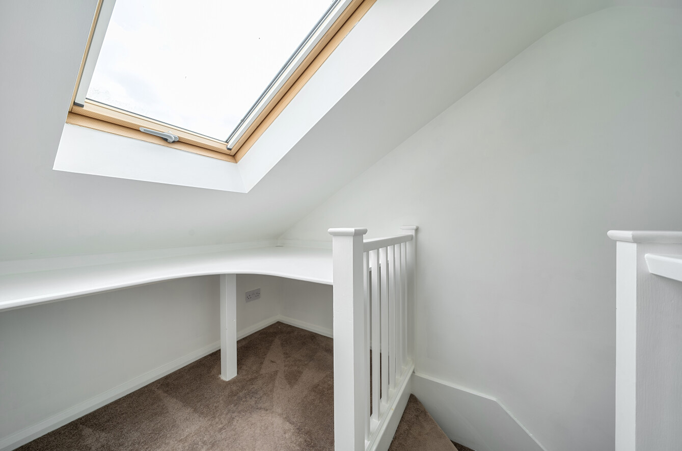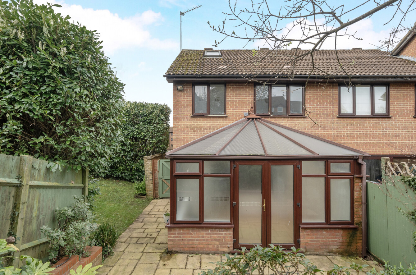 This well looked after end-of-terrace home is located in the popular Merrow Park area and is offered to the market with the benefit of having no onward chain, allowing for a straightforward purchase. Positioned at the end of the terrace, the property enjoys a more private setting with gardens wrapping around the side and rear, creating a pleasant outlook and a sense of space.The ground floor offers well-balanced living accommodation. A welcoming entrance hall with new vinyl flooring leads through to a bright sitting room which overlooks the rear garden and provides direct access into a conservatory. The conservatory creates a pleasant additional reception space, ideal for relaxing or enjoying views of the garden throughout the year. The kitchen/dining room is positioned to the front of the property and provides a practical layout with ample cupboard and worktop space, along with room for a dining table.Upstairs, the first floor offers three well-proportioned bedrooms and a family bathroom fitted with a bath and overhead shower, wash basin and WC, as well as new lino flooring. The bedrooms are light and comfortable, providing flexible space for family living, guests or a home office.The second floor accommodates a spacious fourth bedroom, featuring skylight windows that allow plenty of natural light. This versatile space has bespoke built-in cupboards and access to eaves storage. The second floor also features a practical workspace with a built-in desk area, ideal for working from home or as a hobby area.Outside, the rear garden offers a mixture of patio and planted areas with mature shrubs and trees, creating a private and leafy setting. There is also a garden shed for storage. The conservatory opens directly onto the garden, making it an ideal space for indoor-outdoor living during warmer months.