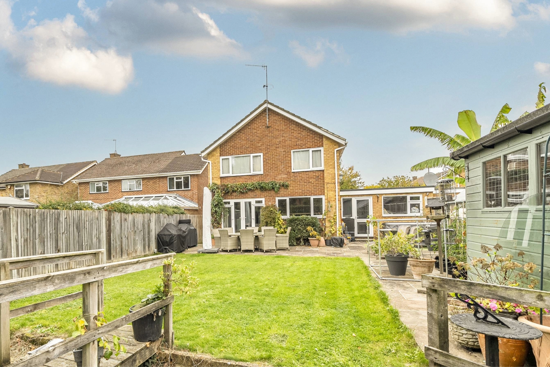 the dining room, which benefits from double glass doors leading directly to the garden. There is also a versatile additional room on the ground floor currently used as a playroom and home office. A separate utility room and a downstairs cloakroom provide extra convenience.Upstairs, all the bedrooms are well-proportioned and tastefully decorated. The principal bedroom includes built-in wardrobes with sliding mirrored doors, while Bedroom 3 features a convenient shower area. The family bathroom is modern and elegant, with sleek tiling and contemporary white fittings.The garden is beautifully maintained, with a stylish patio area ideal for outdoor dining and a neat lawn bordered by fencing and hedging to ensure privacy. There is also space for sheds and greenhouses, making it perfect for both relaxation and practical use. The workshop in the garden is currently fully equipped with electricity, making it a useful and practical space. This property combines thoughtful design with comfort, making it an excellent choice for families seeking a welcoming home in a desirable location.
