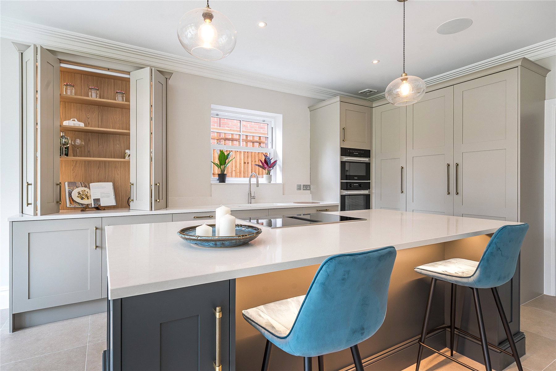 The interior has been carefully designed with modern family life in mind. The centrepiece of the home is the expansive open-plan kitchen, dining and family area, bathed in natural light and finished to a high specification. Sleek fitted units, integrated appliances and generous proportions make this space ideal for both relaxed everyday living and entertaining.