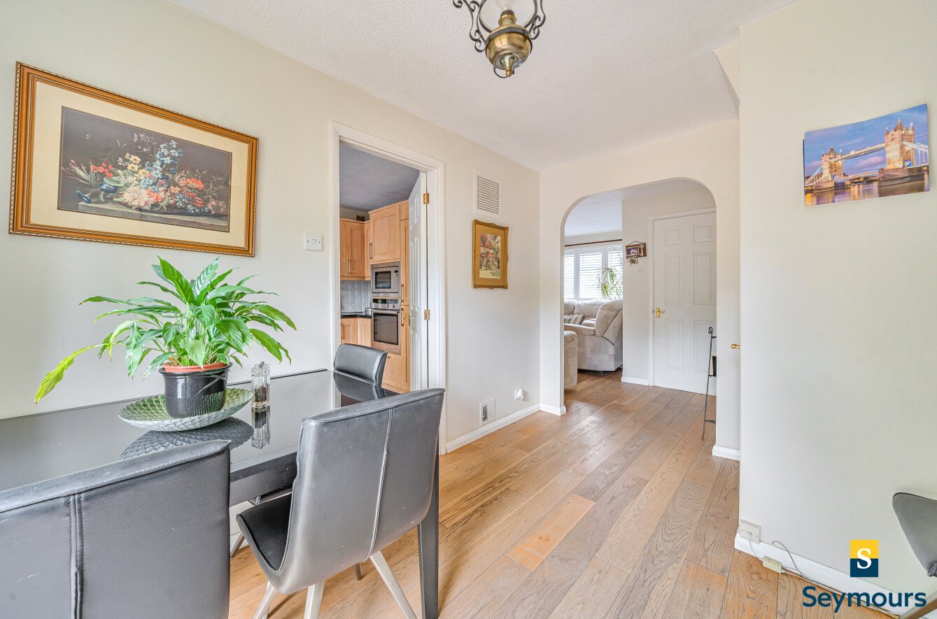 Inside, the home is well decorated throughout and features two reception rooms, creating a flexible and comfortable living space. The ground floor includes a bright and spacious living room with solid wood flooring and cream walls, enhanced by large windows that allow in plenty of natural light. An archway leads to the dining room, which continues the same decor and opens out to the garden via elegant French doors. A stylish kitchen fitted with light wood effect cabinets, black granite-style countertops, and grey tiled flooring offers a practical and attractive cooking space. A downstairs WC adds to the convenience.Upstairs, the main bedroom is fitted with built-in wardrobes with sliding mirrored doors, and features soft carpets and neutral decor. Bedroom two mirrors this style and also includes built-in storage, while bedroom three, also with built-in wardrobes, would make an excellent study or nursery. The family bathroom is fitted with white sanitaryware and has tiled walls for a clean, modern finish.Externally, the property has strong curb appeal with mature ivy surrounding the porch and front entrance, giving it a characterful and welcoming look. The rear garden is well maintained, featuring a neat patio area and a lawn bordered by mature hedges and trees, providing privacy and greenery. Located within walking distance of local amenities and schools, this is a beautifully presented home in a highly convenient location, perfect for a growing family.