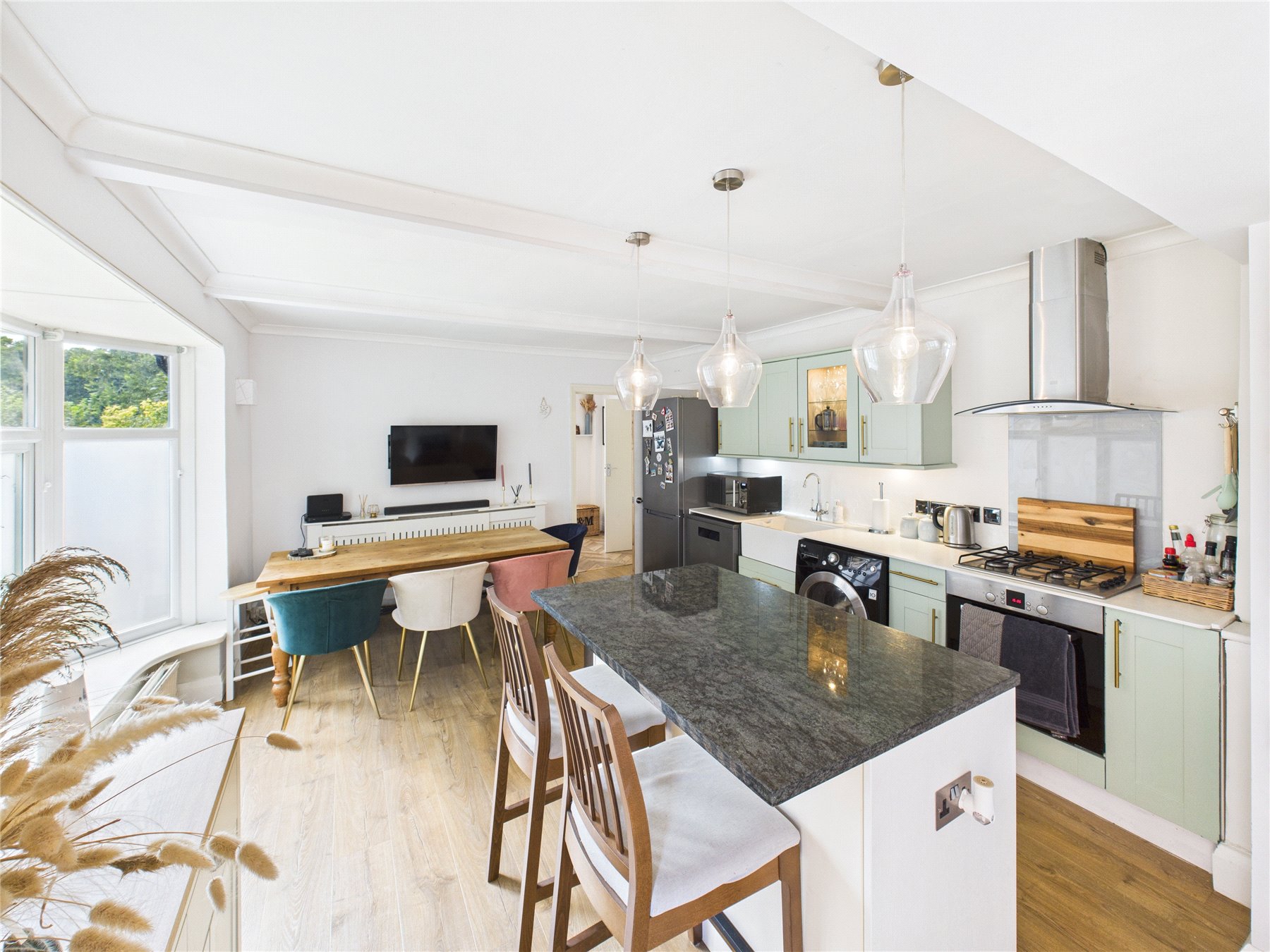 The heart of the home is the impressive open-plan kitchen and dining area. This space benefits from natural light and ample room for cooking, dining, and relaxing, making it perfect for entertaining or everyday family life. The main living room, located to the front of the maisonette, features a stunning bay window and wood-style flooring that adds both warmth and character to the space.