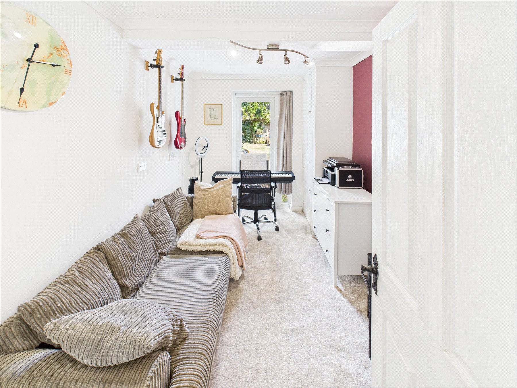 The primary bedroom is generously sized and benefits from an en-suite shower room for added convenience and privacy. A second versatile reception room, currently used as a study or snug, enjoys direct access to the private garden through glazed doors, offering a lovely indoor-outdoor connection. This room could also function as a second bedroom depending on the buyer's needs.