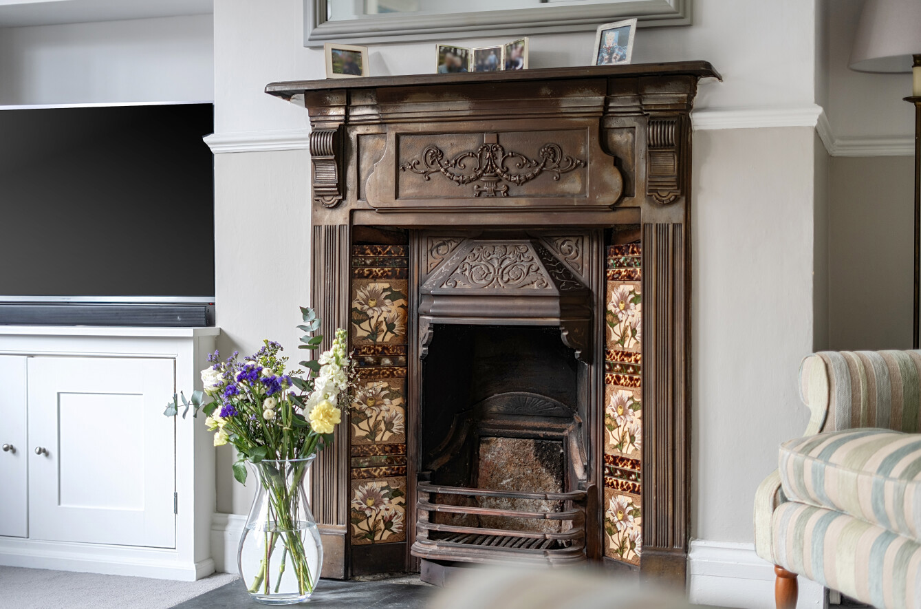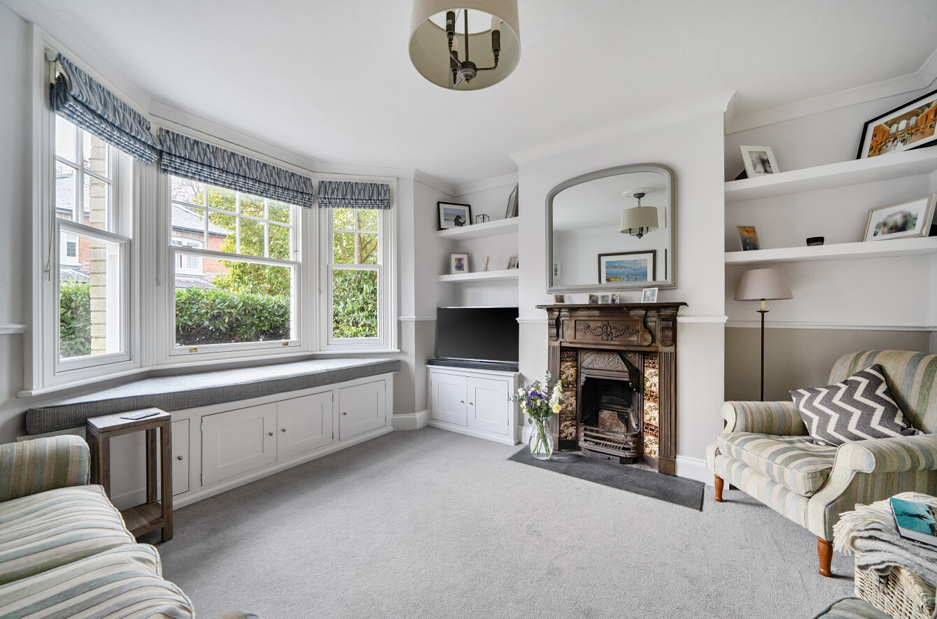 - Bay-fronted sitting room with feature fireplace and window seat