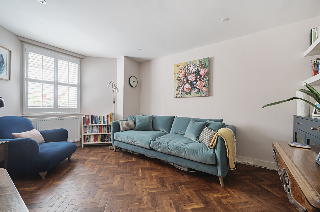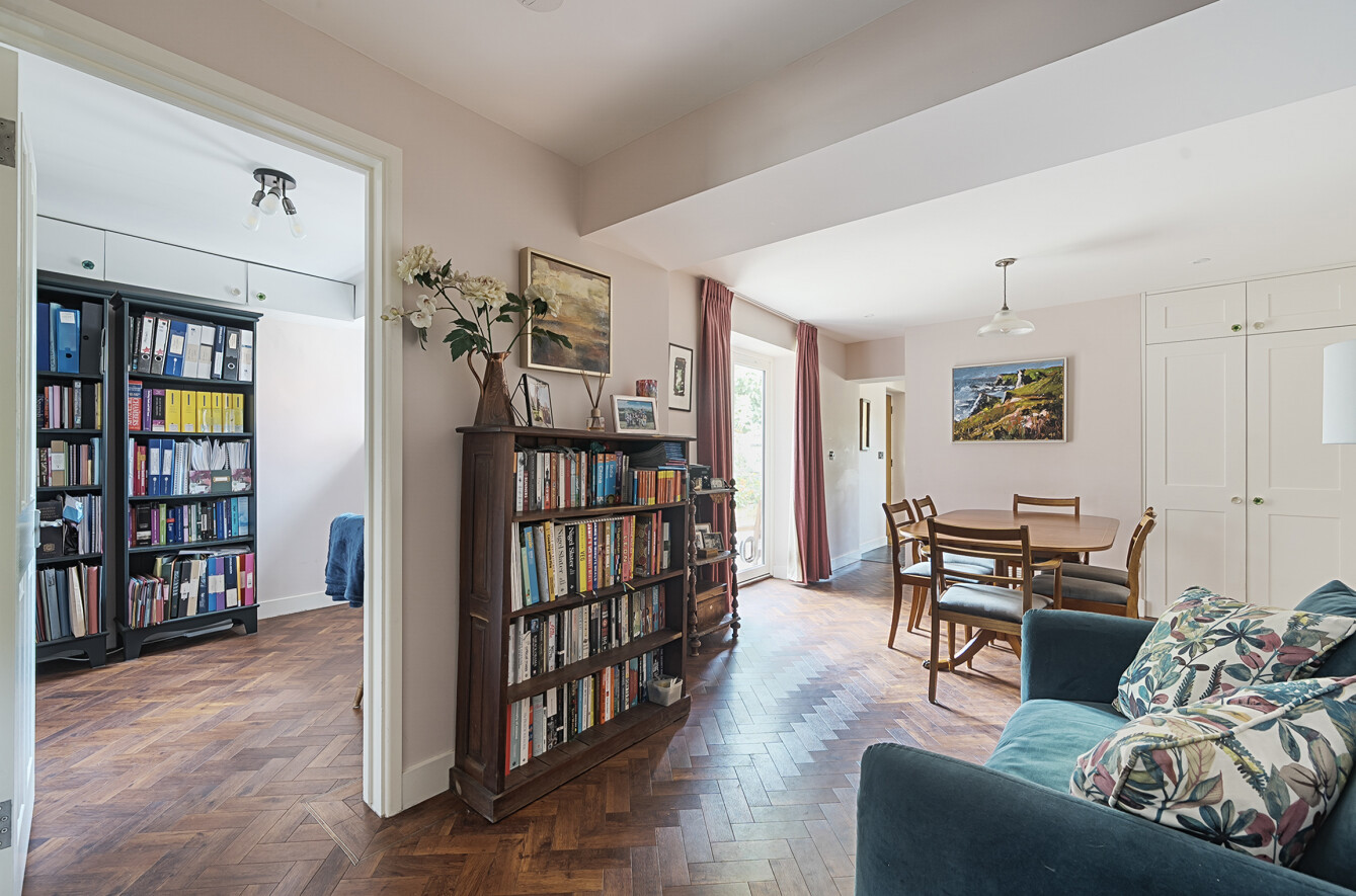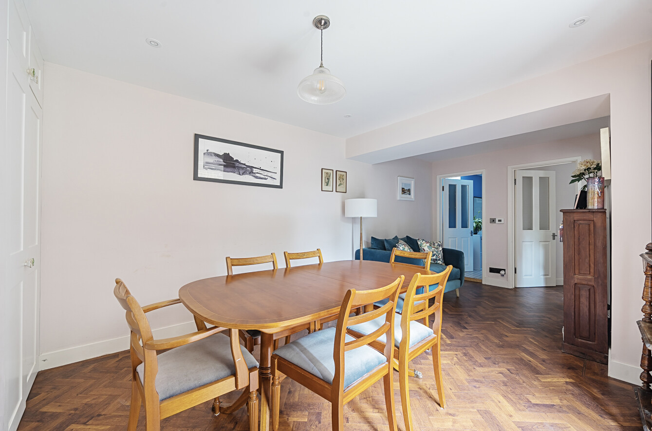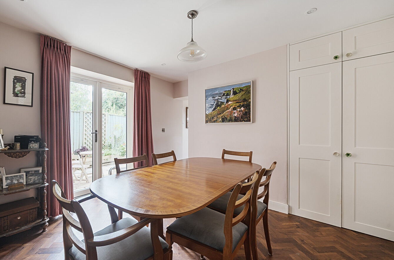 - Spacious sitting/dining room with herringbone flooring and French doors to garden