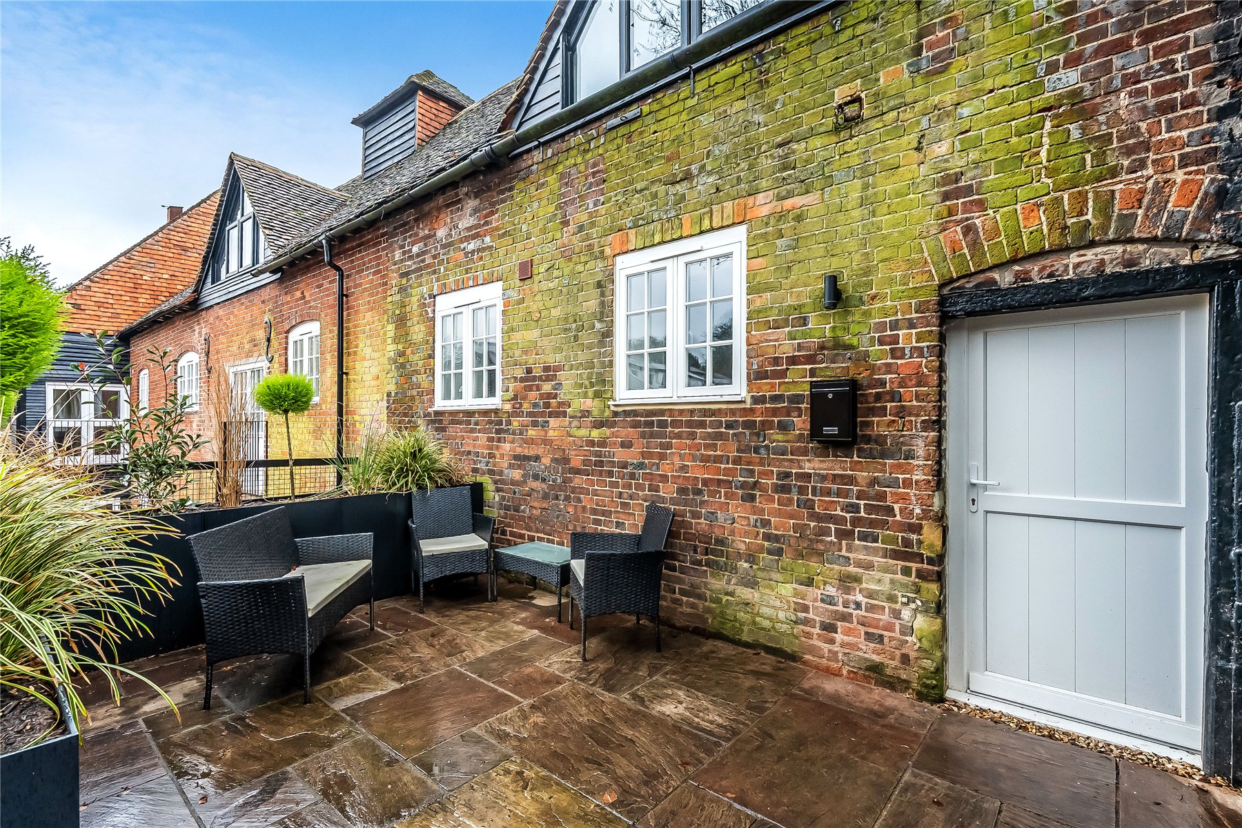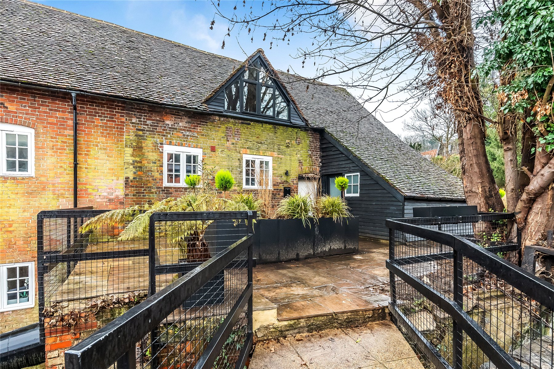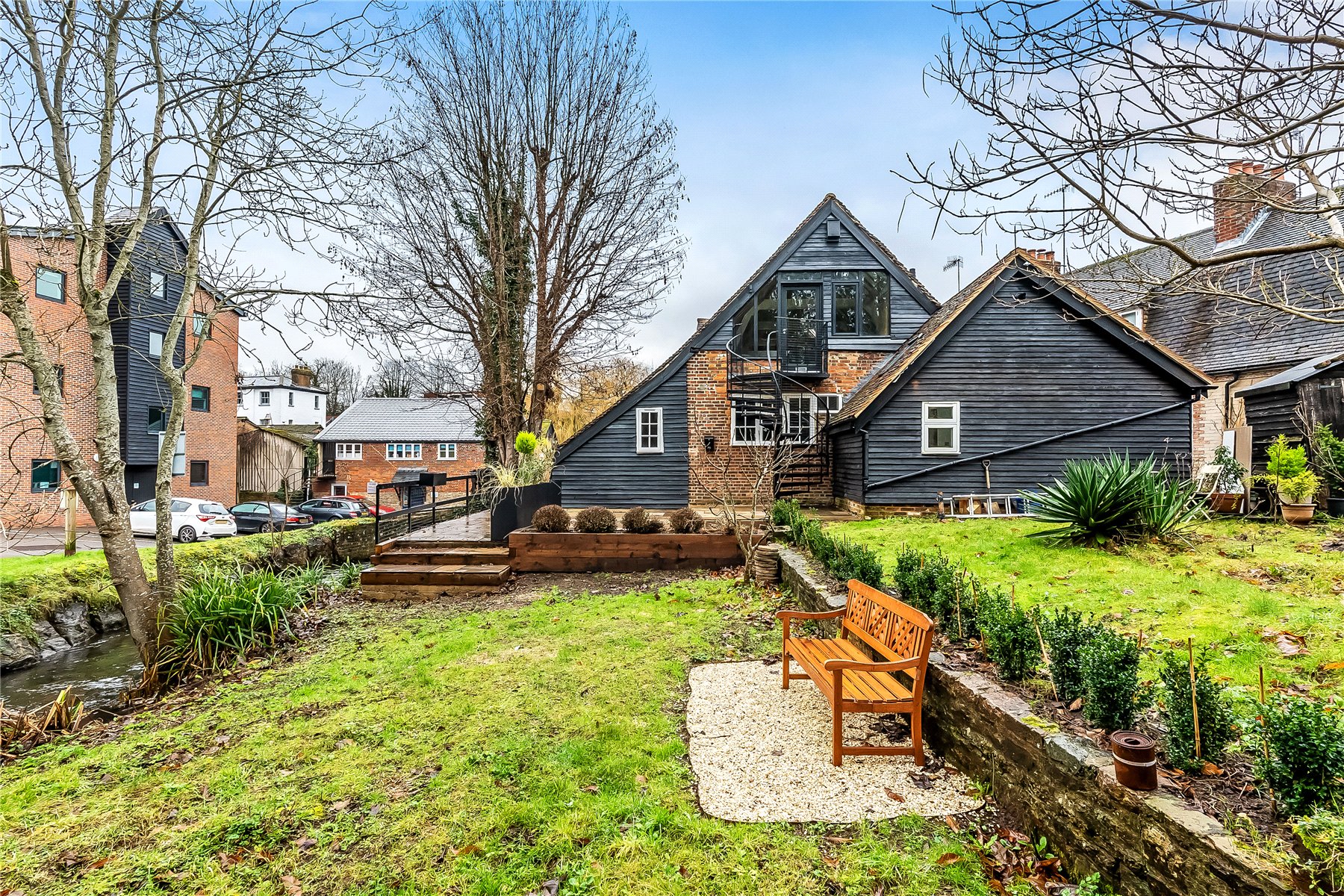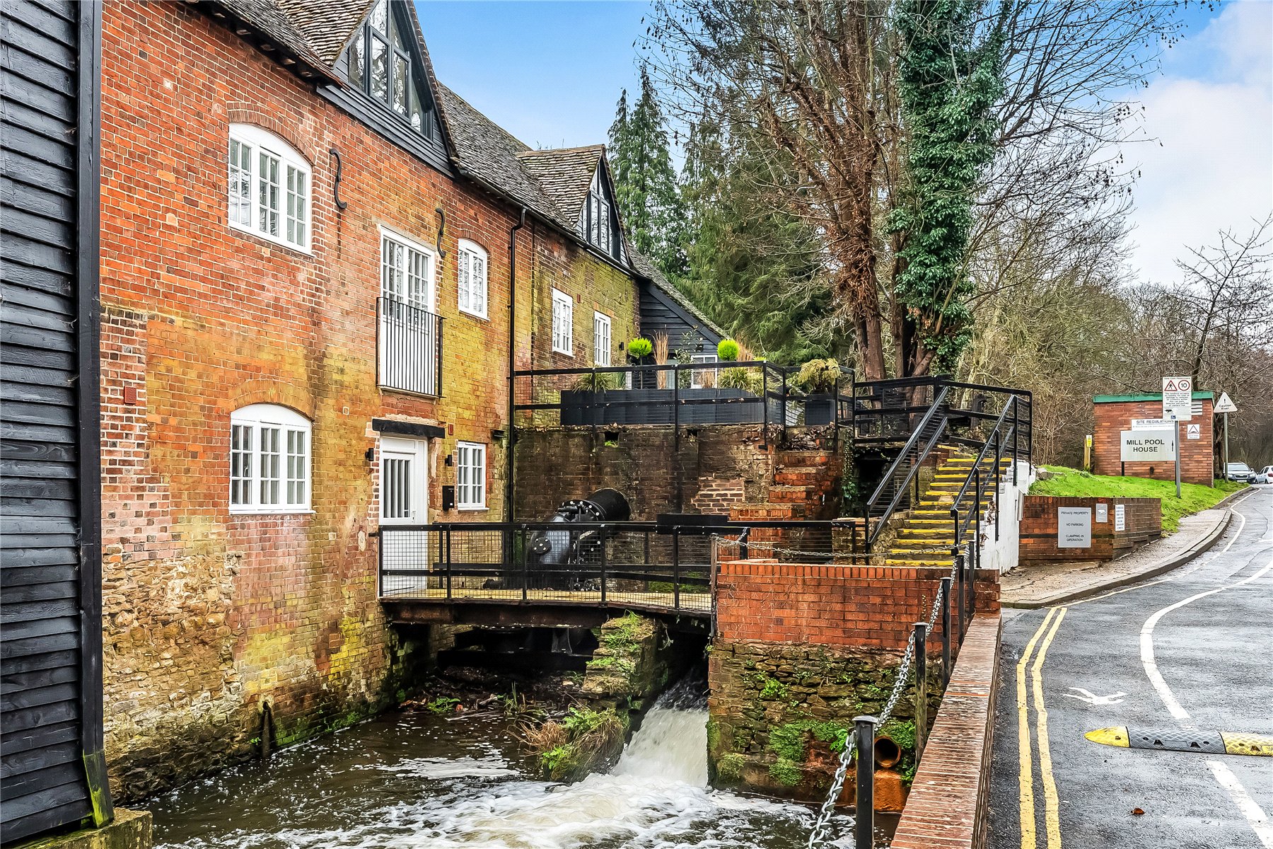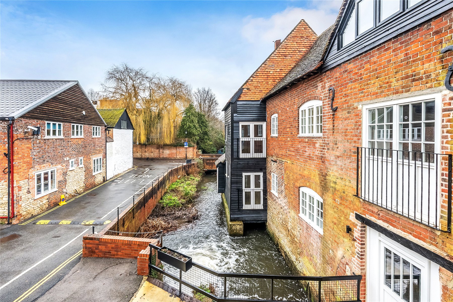 Grade II listed mill conversion 2-bedroom apartment for sale in Godalming. with exposed beams, patio, parking, share of freehold and 1-minute walk to station. Ideal for commuters and downsizers.