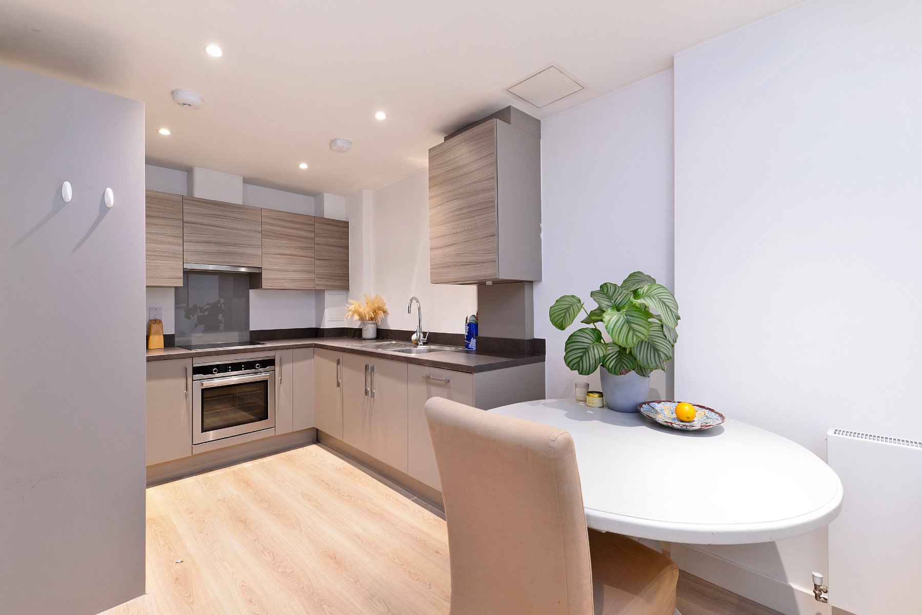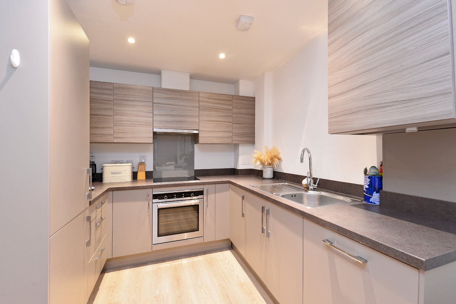 - Sleek fully fitted kitchen with integrated appliances and cashmere and teak grain cabinets