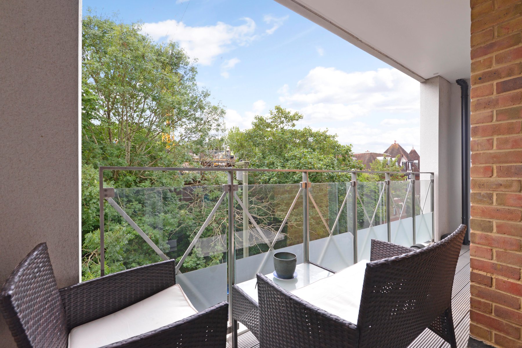 - Excellent south-facing covered decked balcony with glass balustrades and leafy views