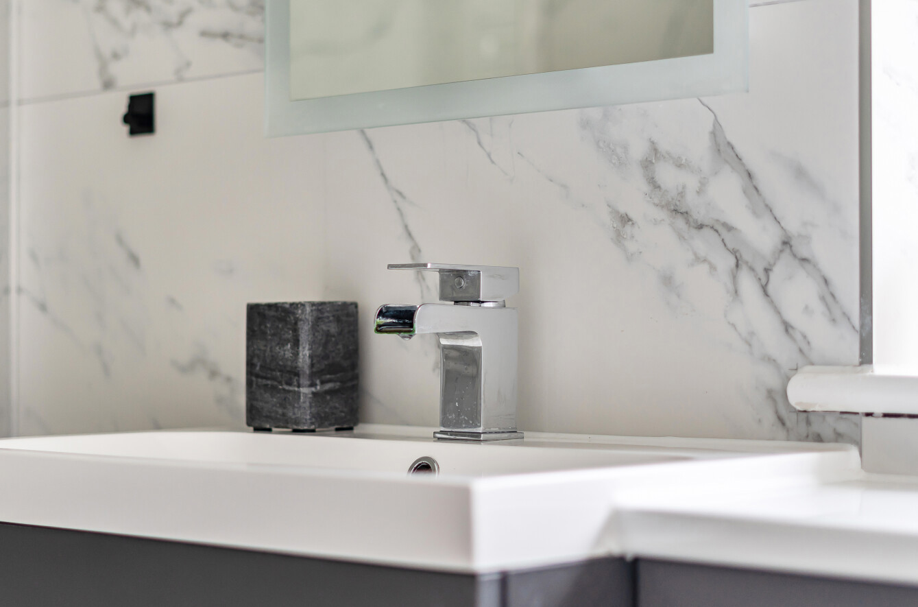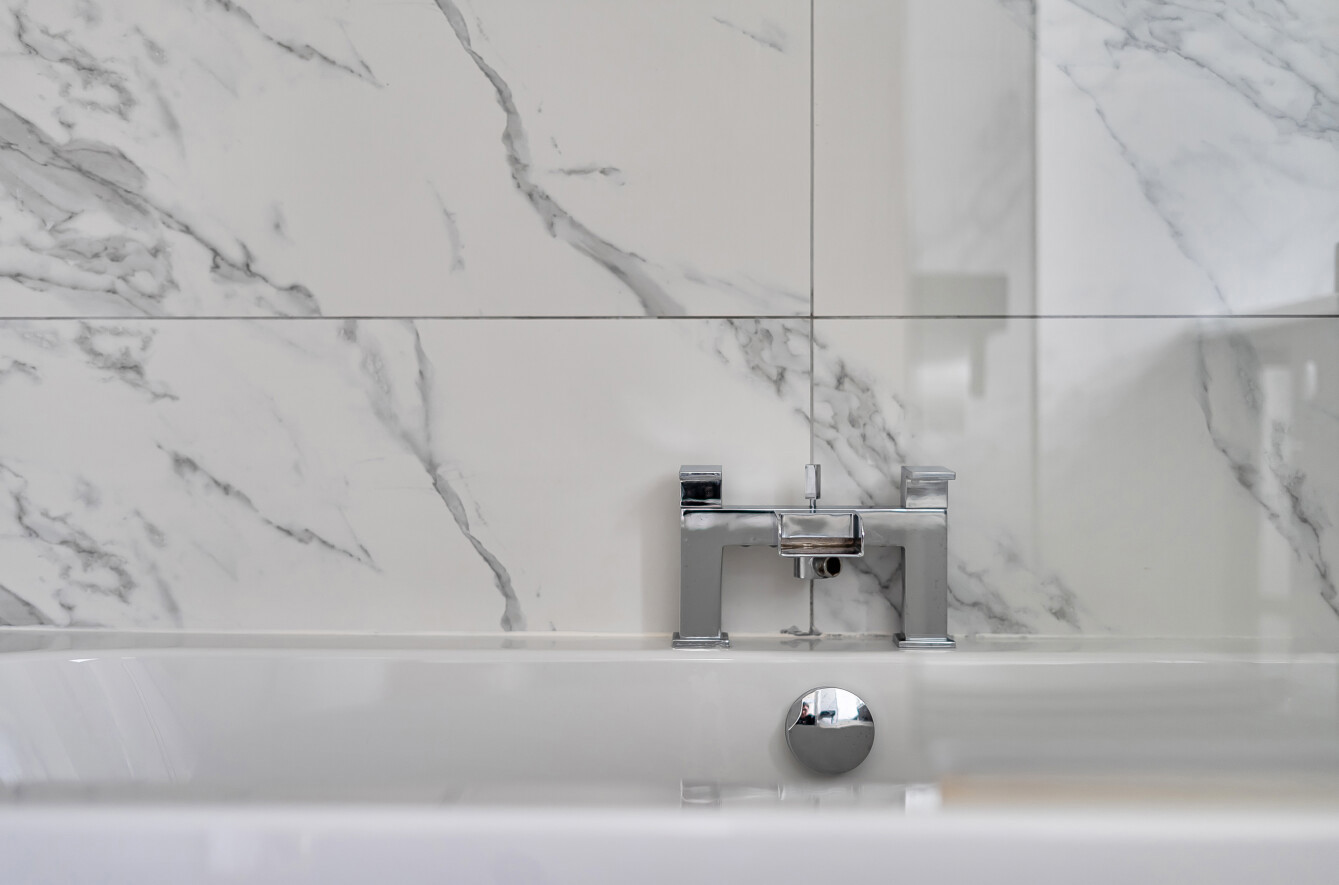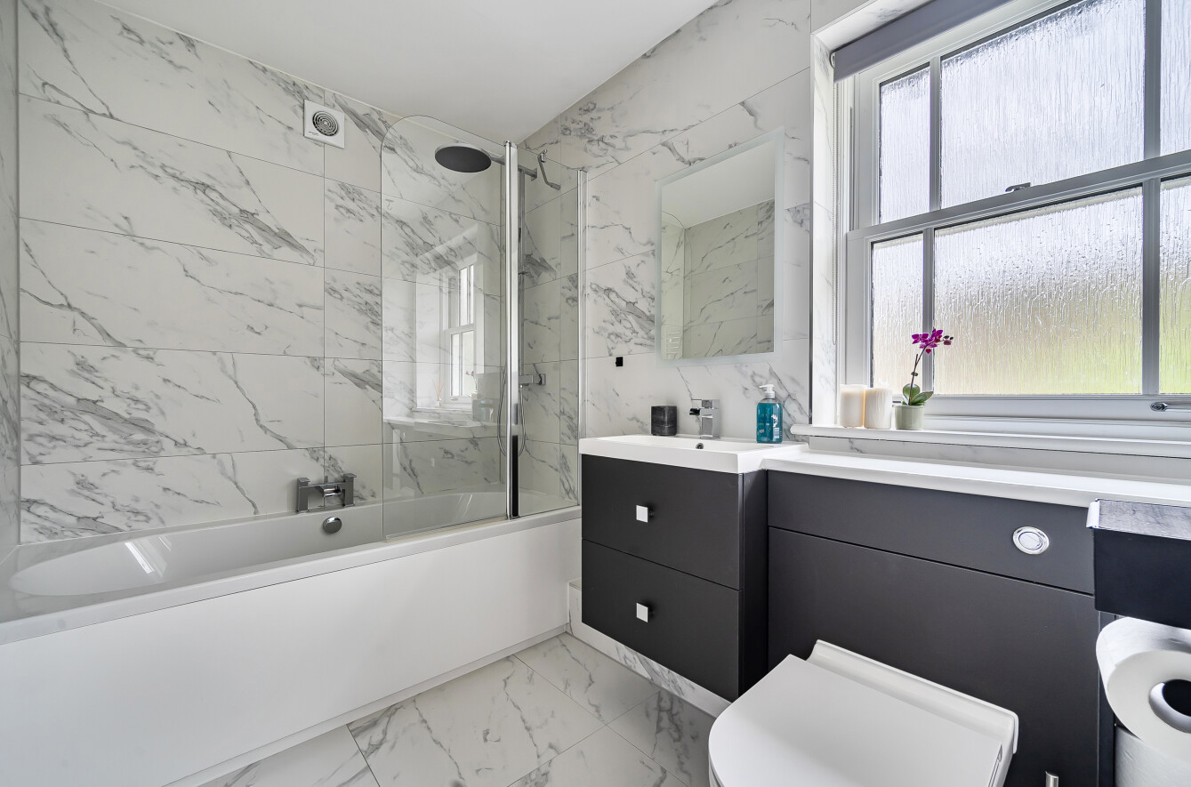 - Stunning bathroom with marble-effect tiling and shower over bath