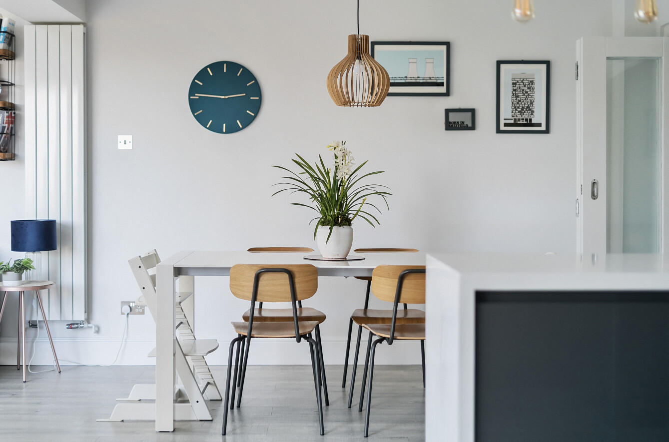 - Sleek handleless kitchen with integrated appliances and bar stool seating