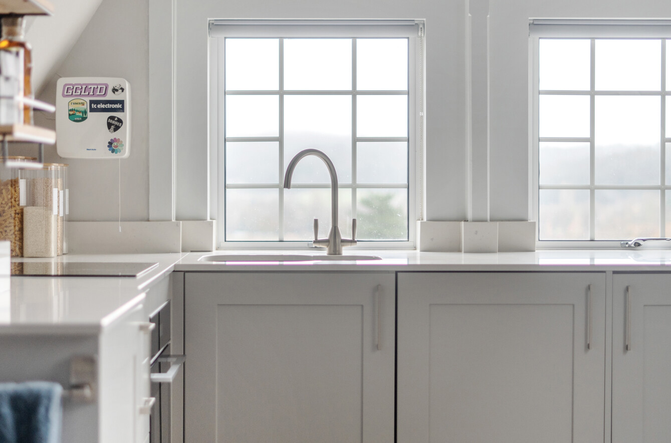 - Shaker-style kitchen with quartz countertops and integrated appliances