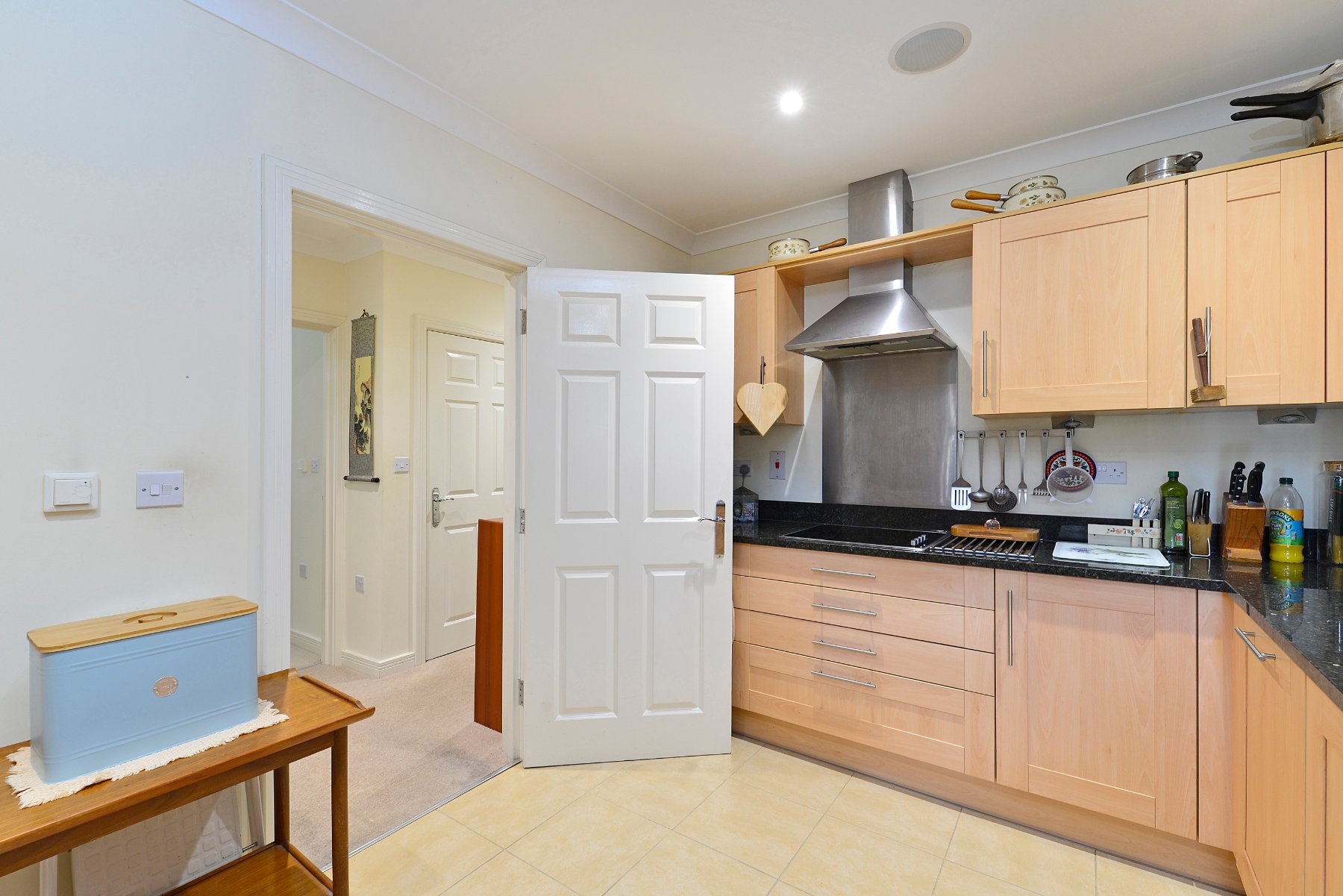 - Shaker style kitchen with integrated appliances and granite countertops