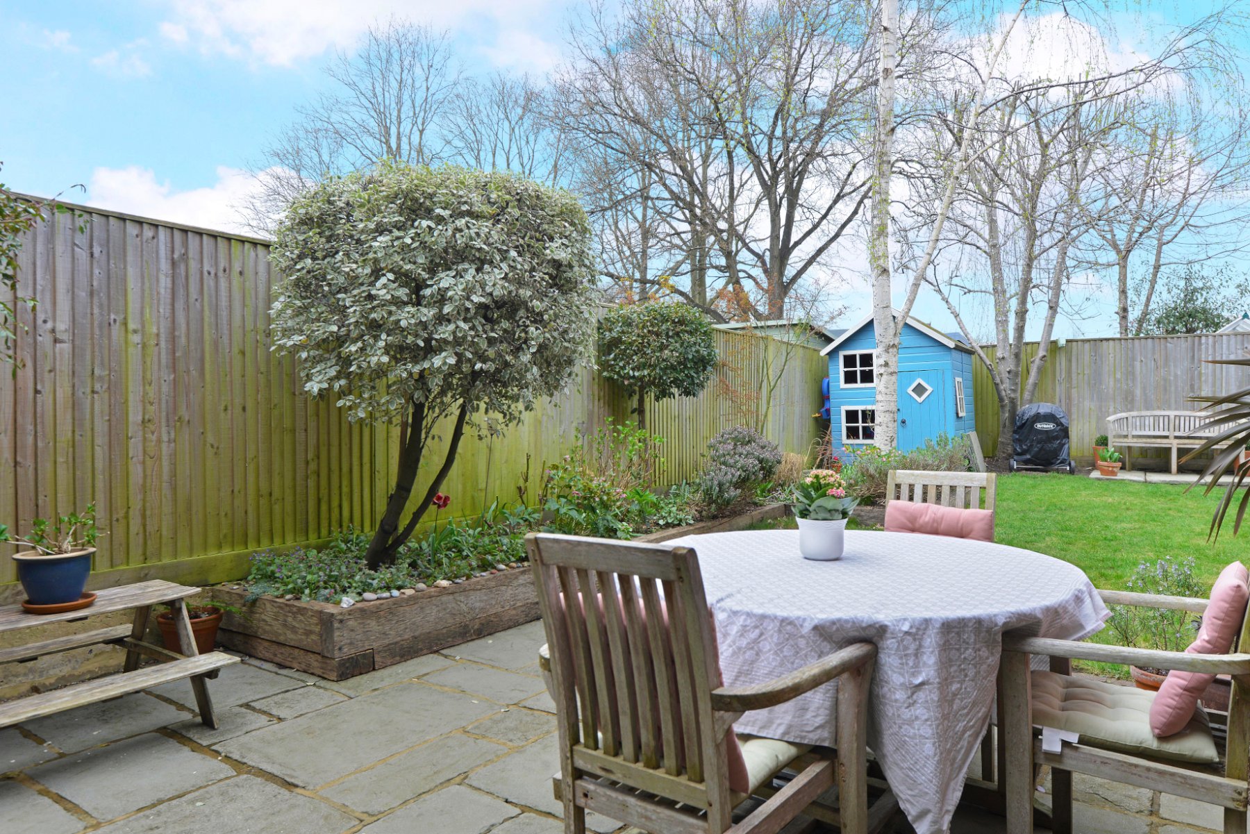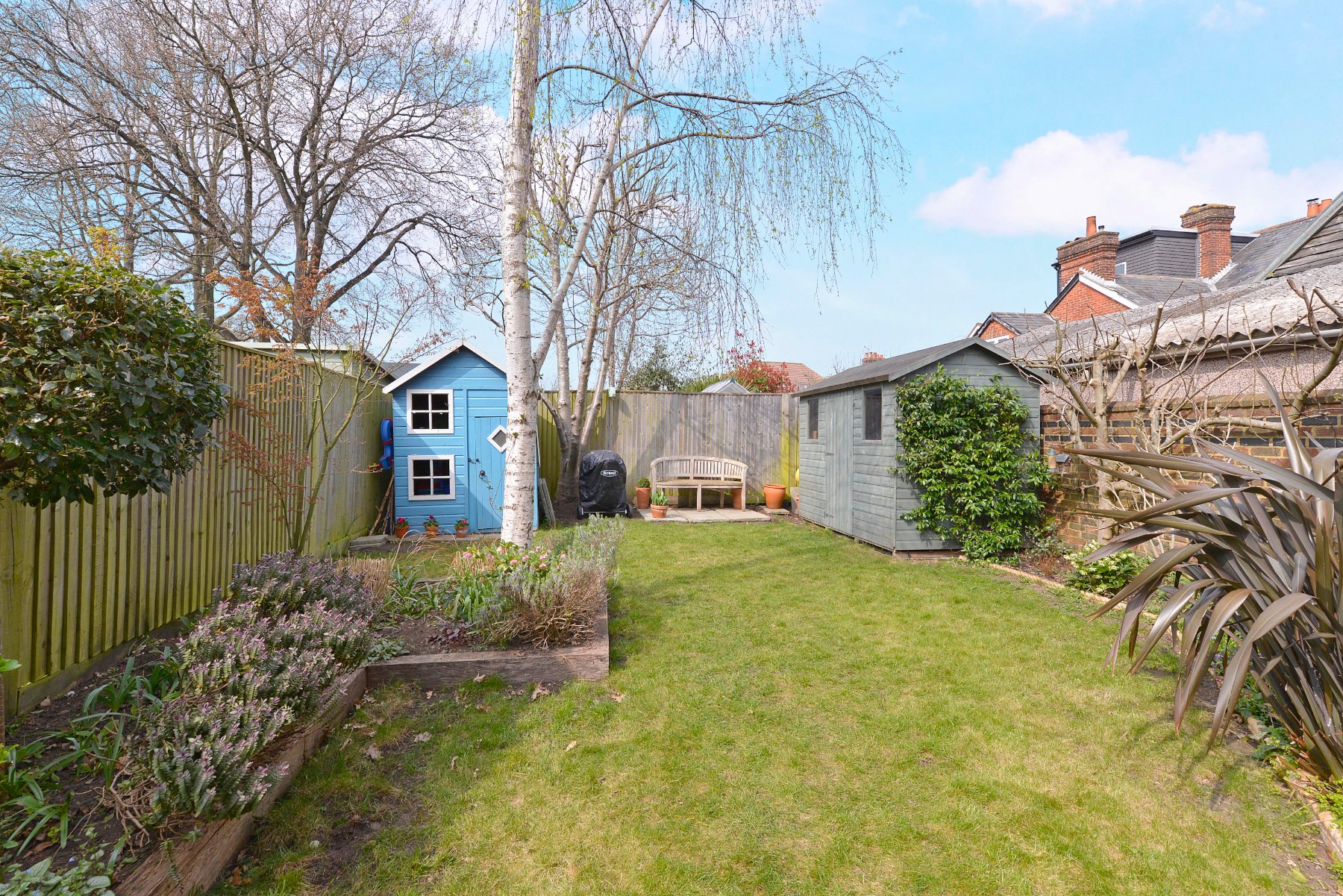- Raised frontage and impressive west-facing rear garden with paved patios, established lawn and timber beds