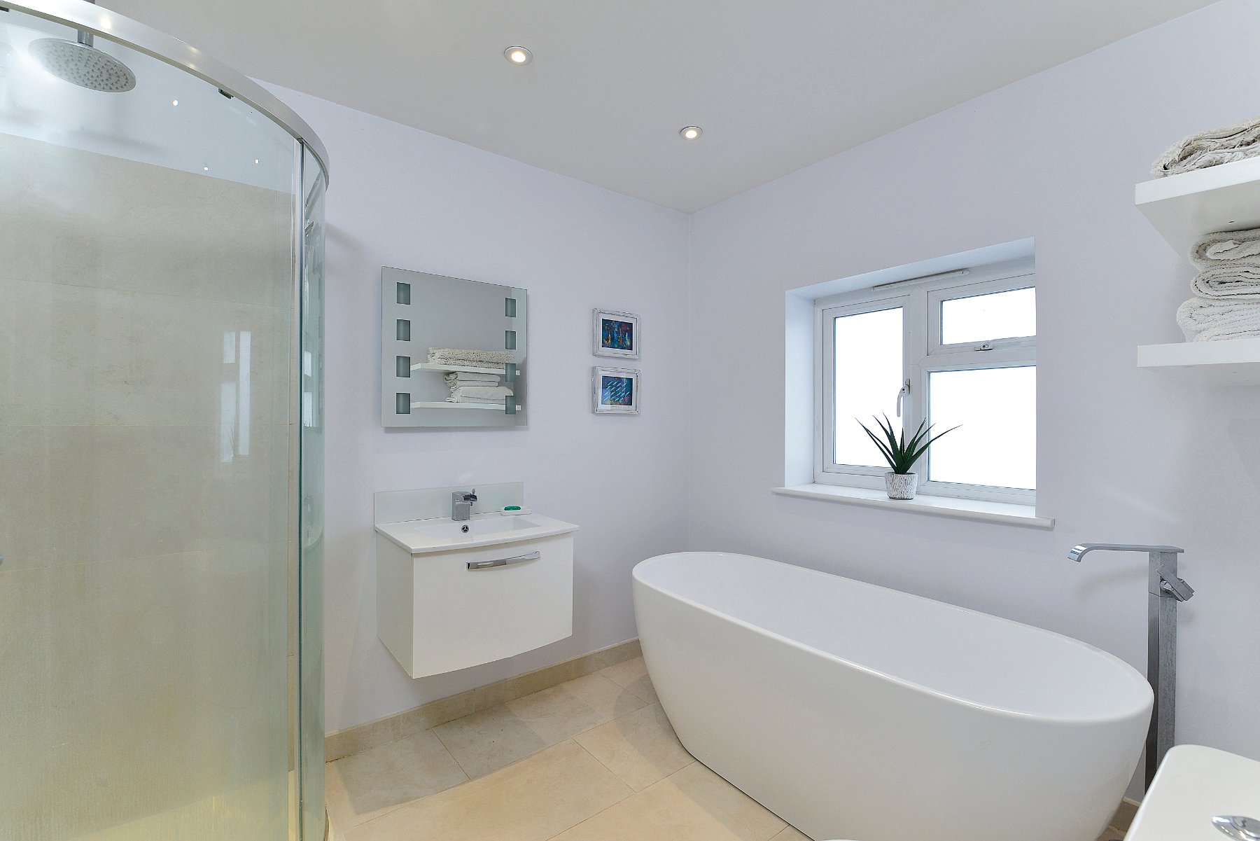 - Stunning luxury family bathroom with contemporary freestanding oval bath and walk-in rainfall shower