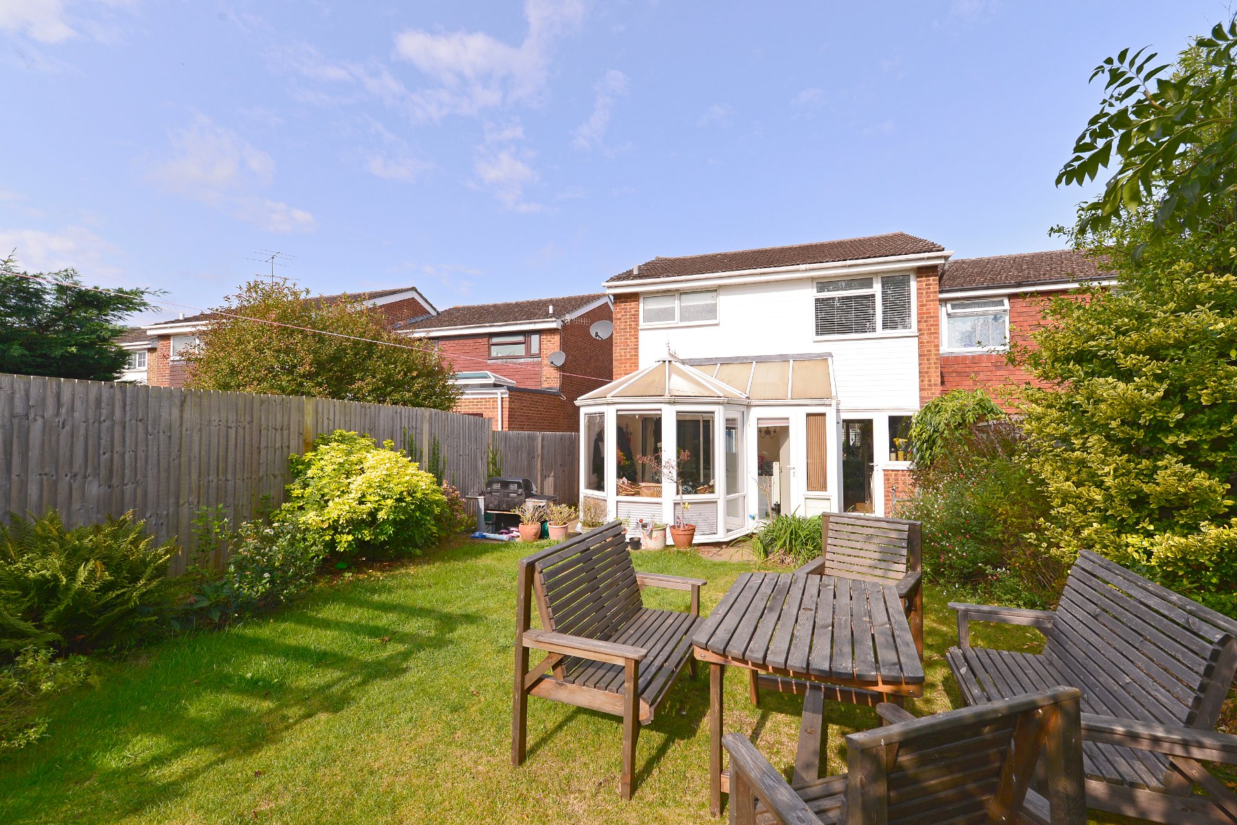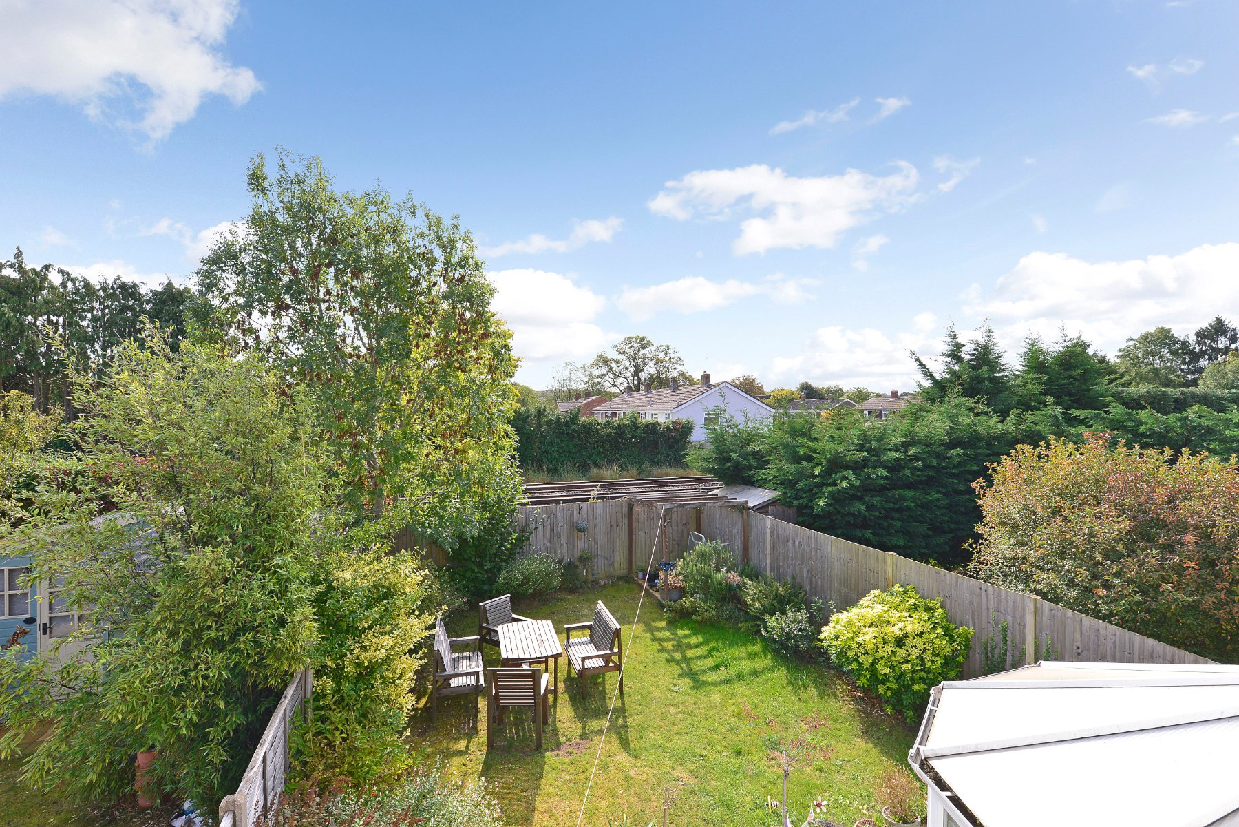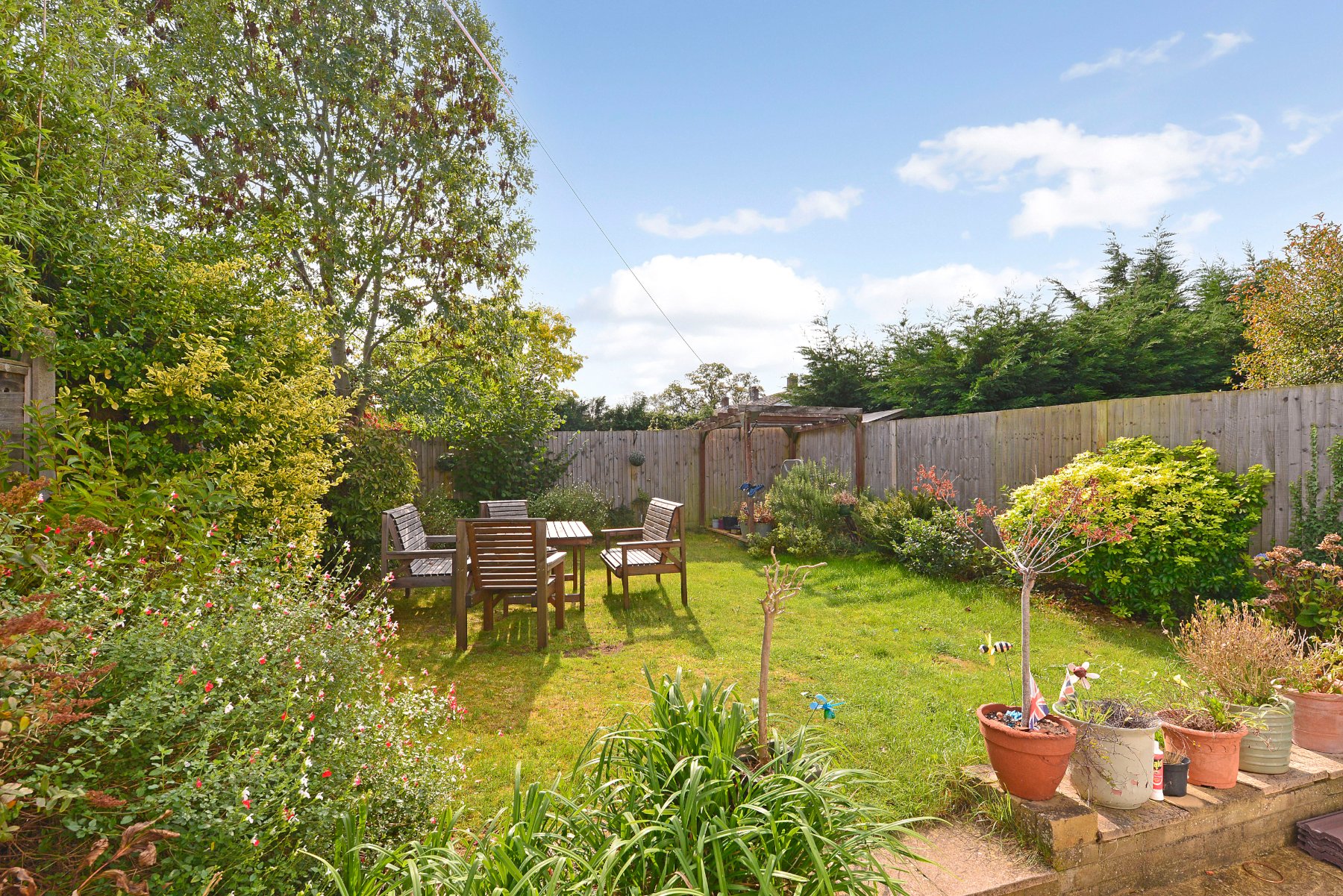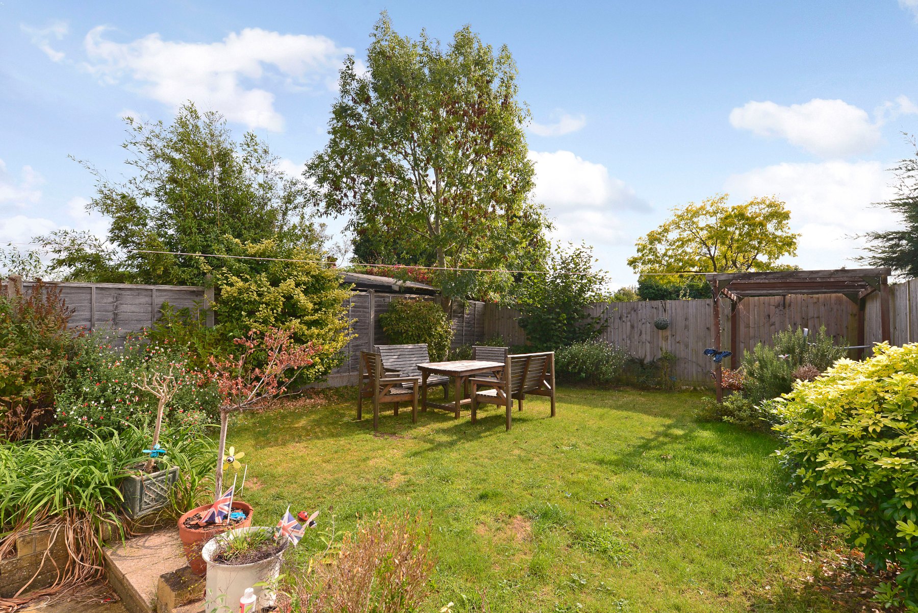 - Charming south-facing garden with patio, lawn and decked pergola