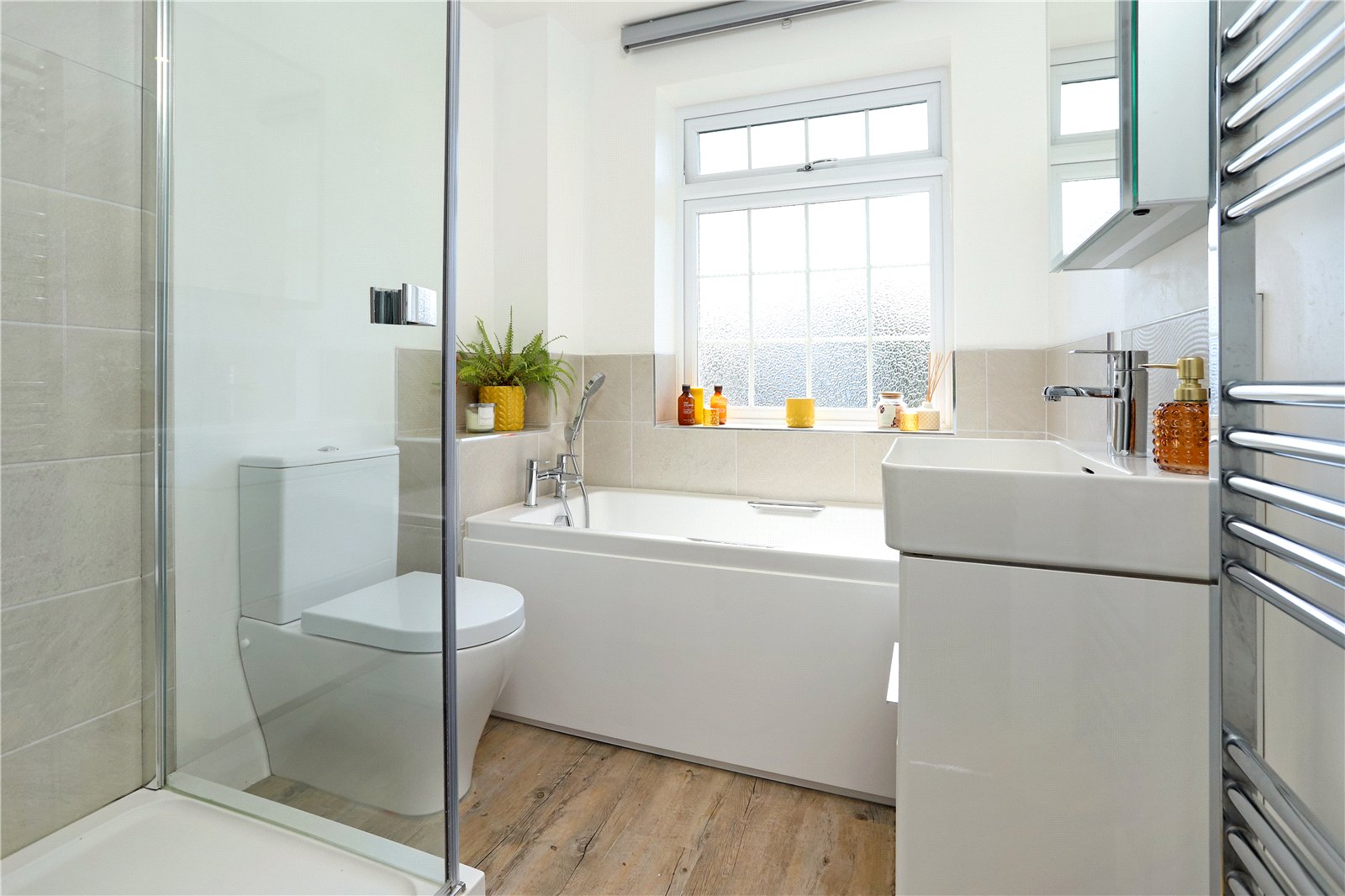 Modern bathroom In classic white, frosted window, panel enclosed bath, mixer tap shower, separate fully tiled shower cubicle with screen, w.c., vanity wash hand basin with drawers under, heated towel rail.