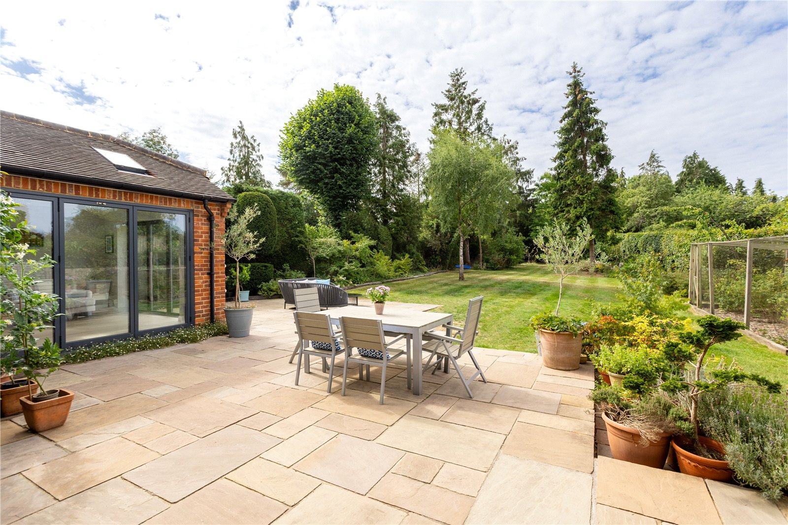 Outside Sitting on a 0.35-acre plot, the south-facing garden has been landscaped to offer a wonderful balance of lawn, mature borders and entertaining space. Its perfect for children to play, for summer barbecues, or simply enjoying a quiet coffee in the sunshine. Theres also space for al fresco dining and garden parties.