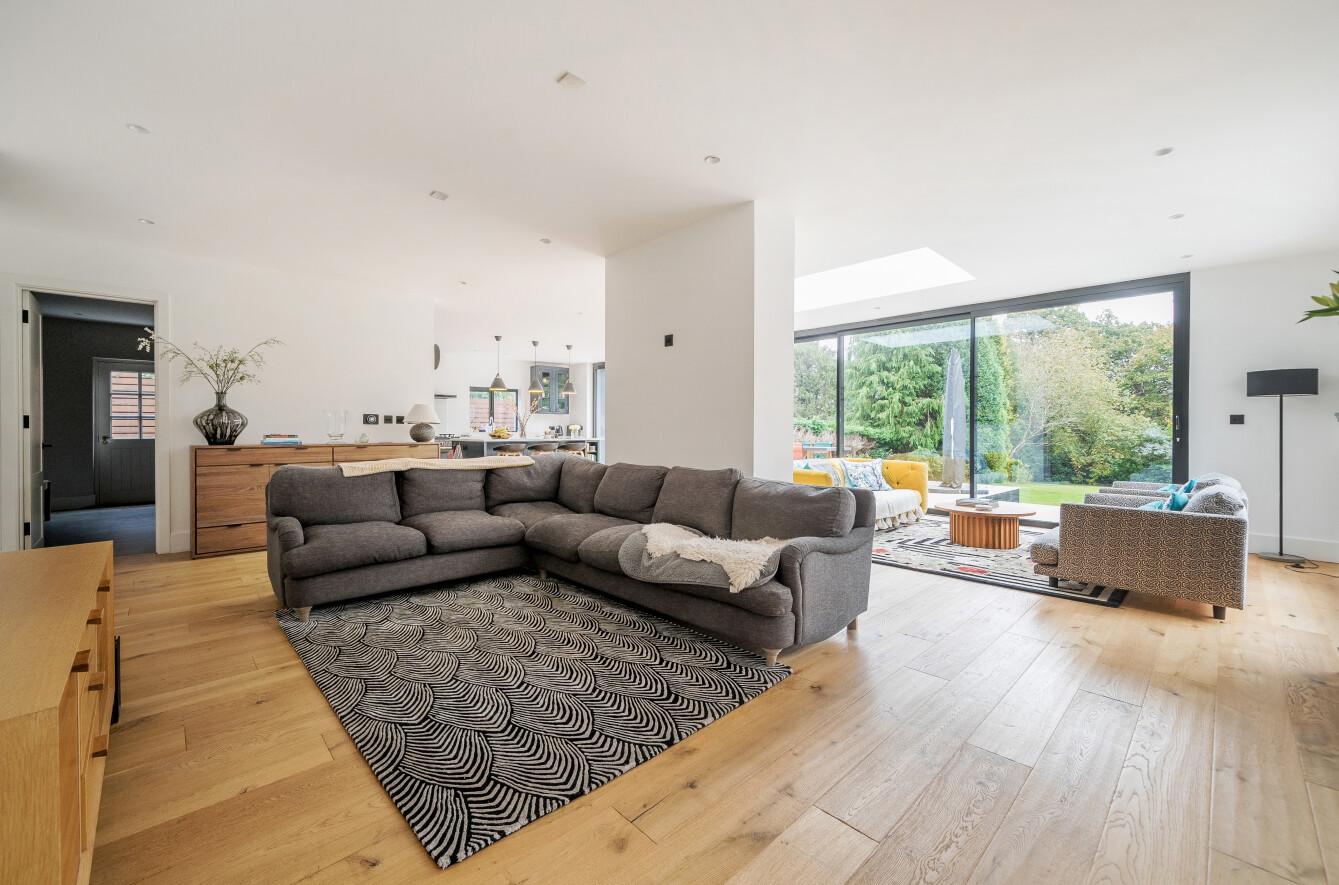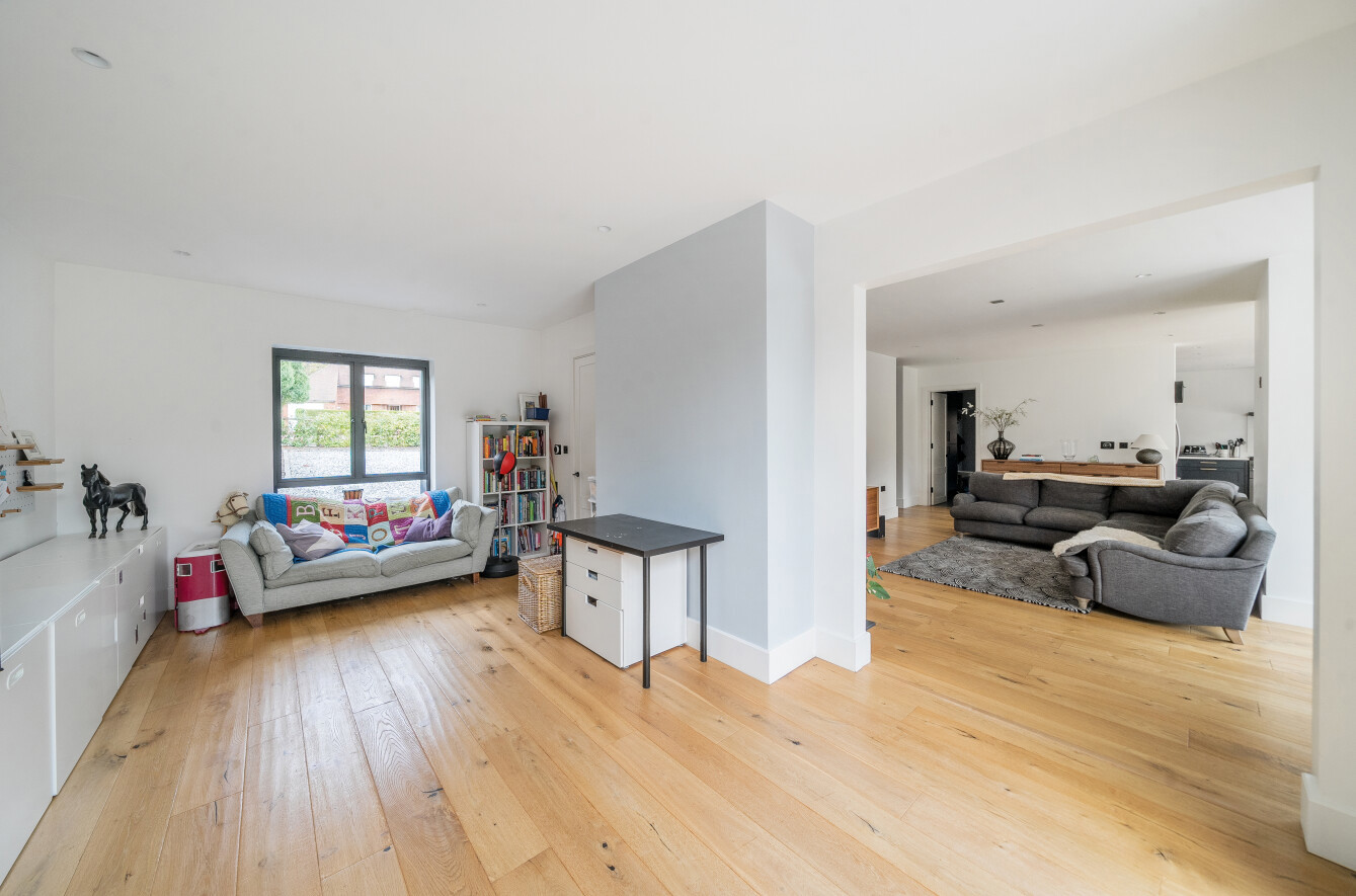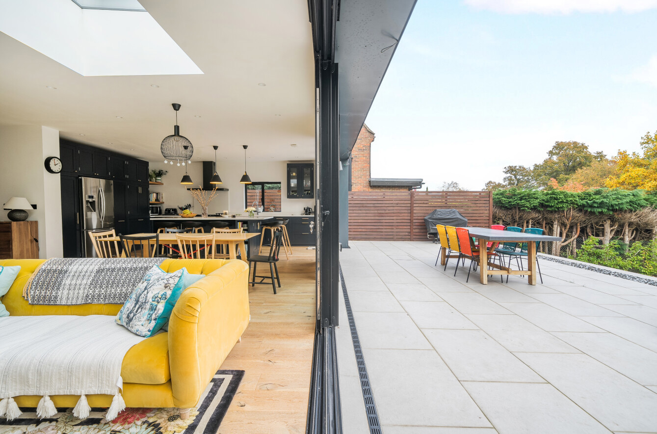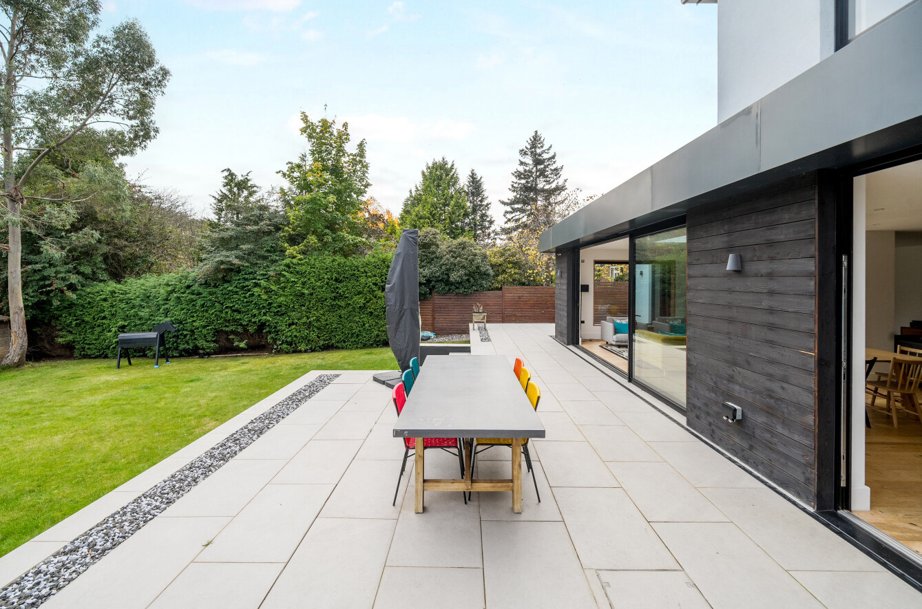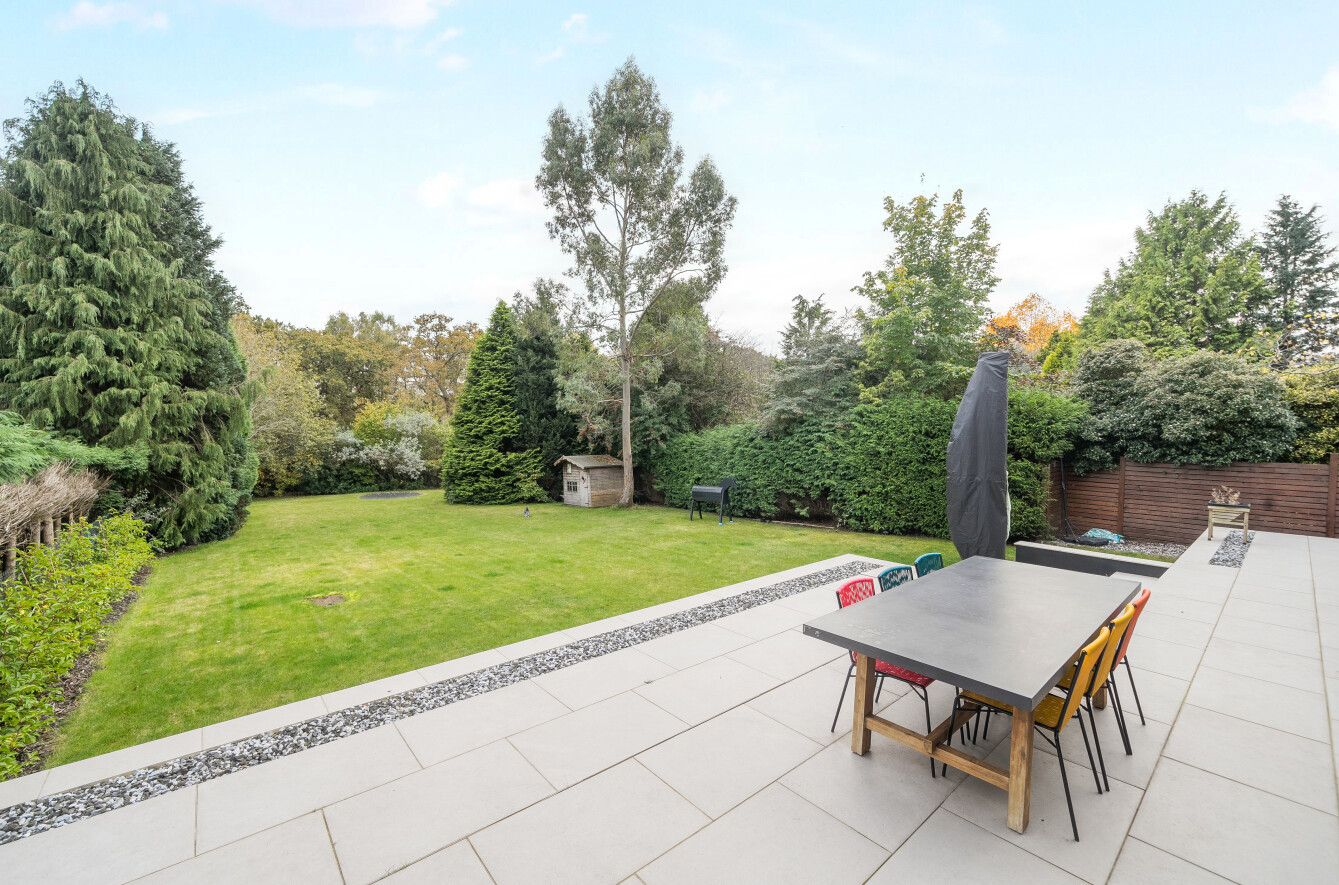 The final room on the ground floor is a double aspect family room with bi-folding doors out onto a deep paved patio which extends across the whole of the rear of the house to the kitchen. A great space for al fresco dining and entertaining.