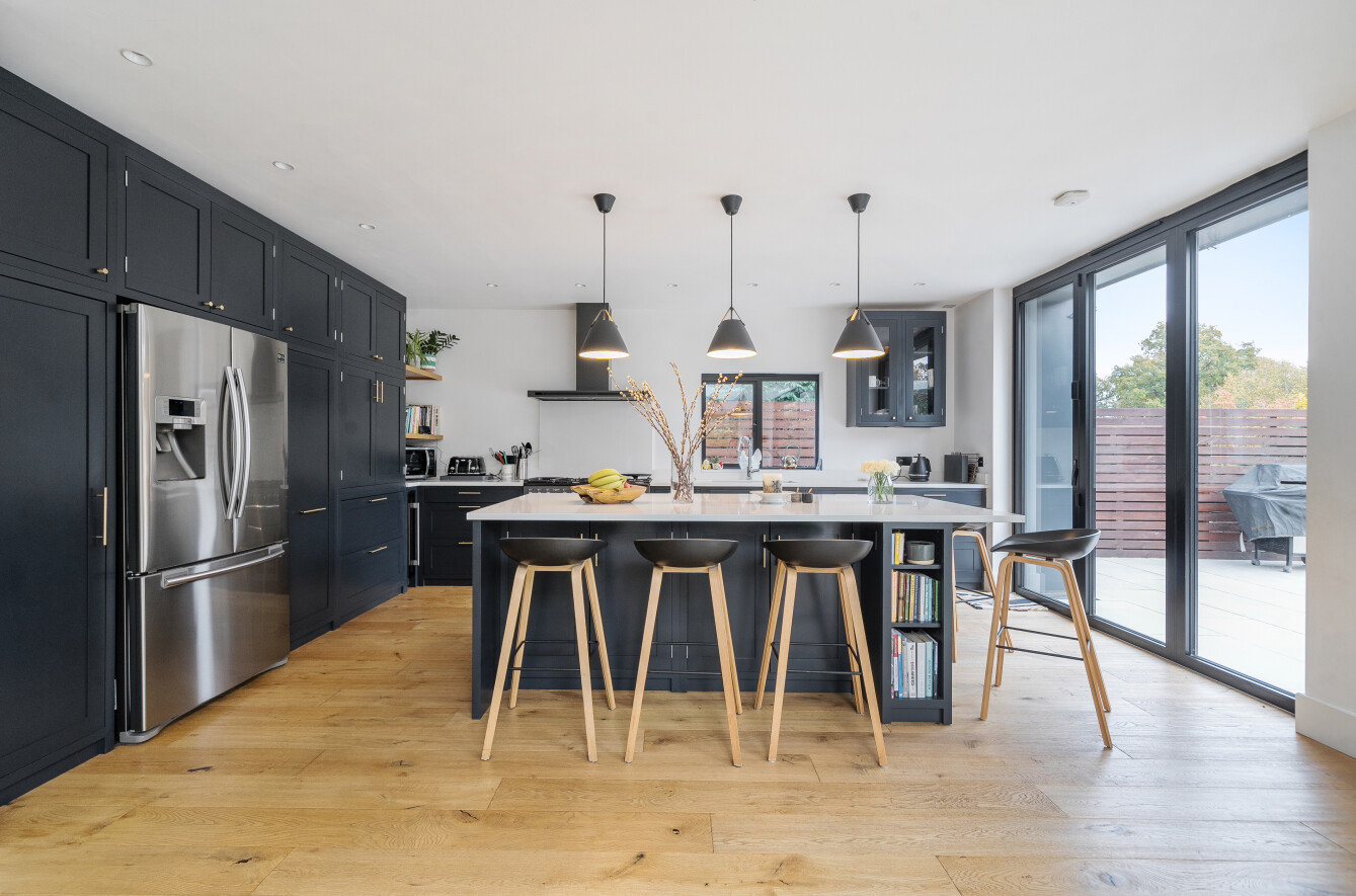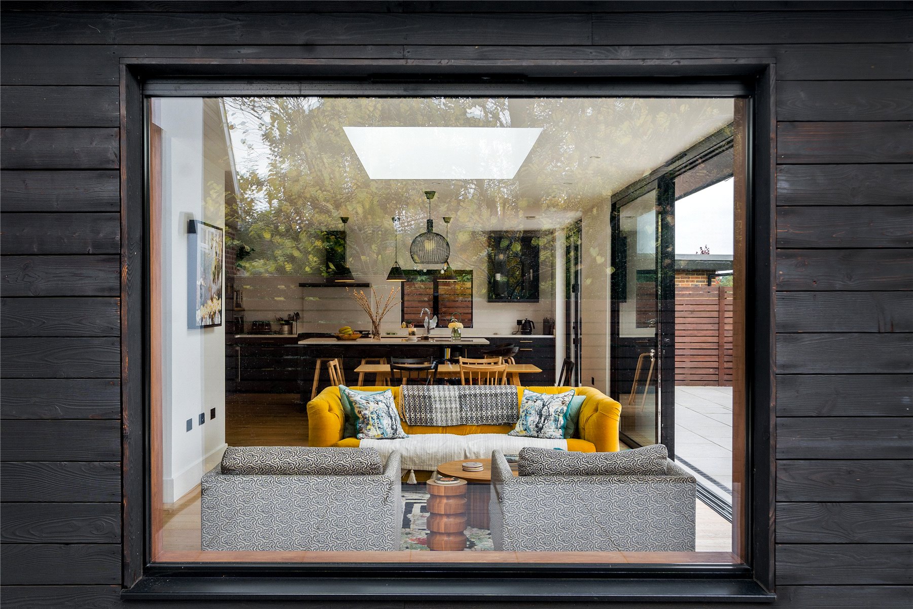 The wow moment comes when you pass beyond the hallway to the rear of the house, where the accommodation opens up into a large open plan family space. The heart of the home; triple aspect, 36'6 wide, with large roof lantern and both bi-folding and large sliding patio doors onto a south facing garden, the light in this room is phenomenal. The spaces within can be moved and shaped to suit your family needs, whilst still offering clearly defined kitchen, dining and lounge areas. There is underfloor heating throughout the ground floor, and it suits this open plan reception space perfectly. The kitchen is extremely well equipped with a large central island/breakfast bar and generous storage options. Complimenting this is a separate utility room with additional fridge/freezer and dishwasher and space/plumbing for a tumble dryer and washing machine. There is an integral door into the garage as well as a side door to the garden.