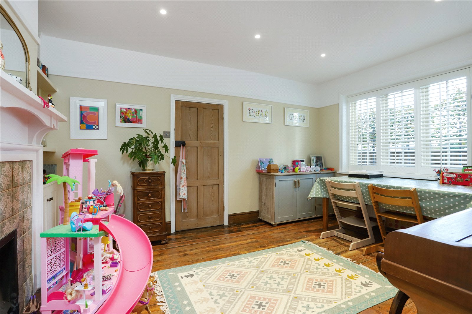 Playroom Front aspect, window shutters, tiled fireplace (not in use), further cupboards and shelving set into alcoves, exposed floorboards.