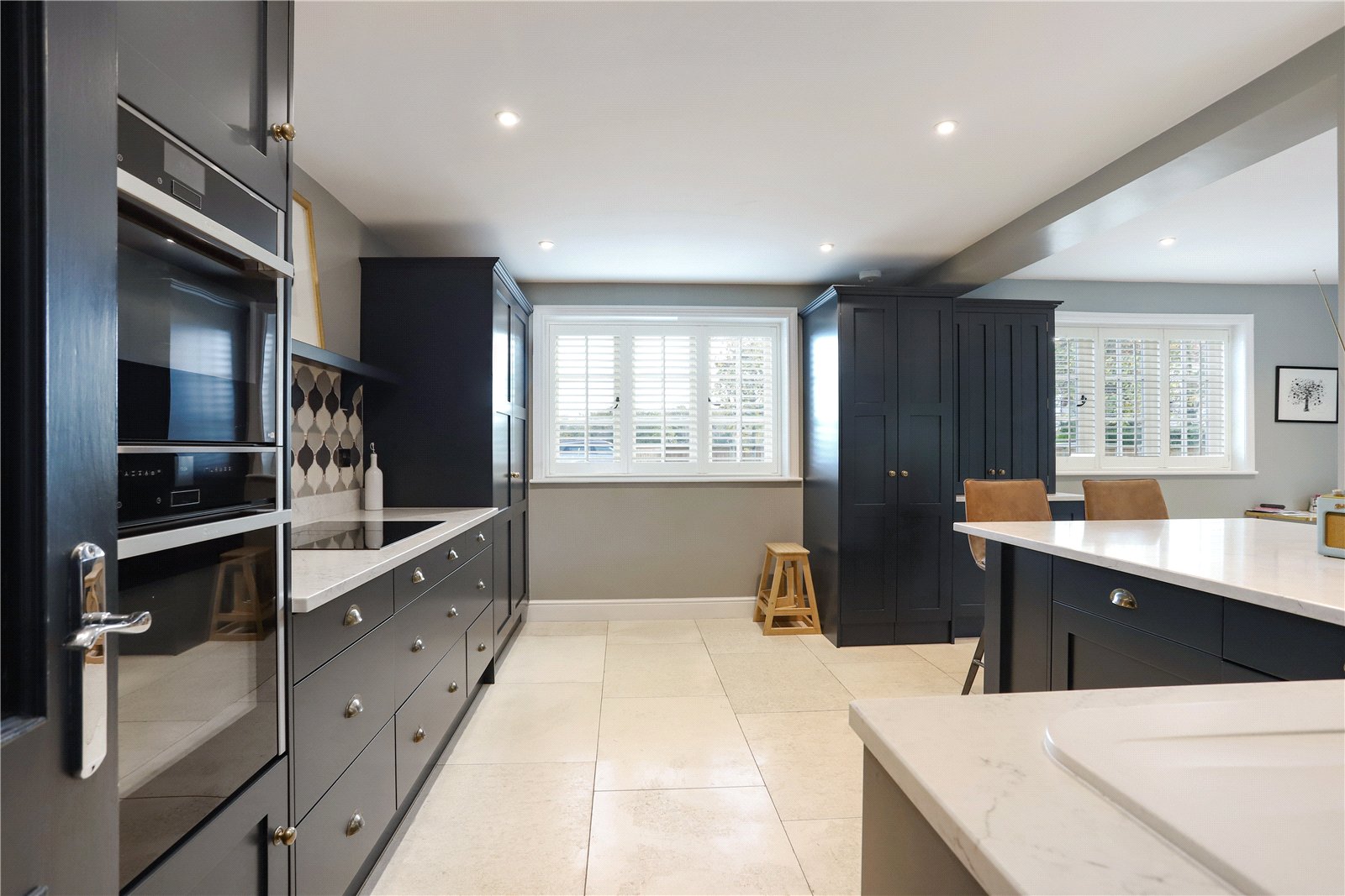 Stunning kitchen/dining room Beautifully fitted John Lewis of Hungerford kitchen with a wealth of eye and base level units, quartz worktops and breakfast bar, sink unit and Quooker mixer tap, induction hob with integrated extraction, Neff electric double ovens, integrated fridge/freezer, pull out bin store, integrated dishwasher and large larder cupboard, limestone flooring with underfloor heating and attractive window shutters.