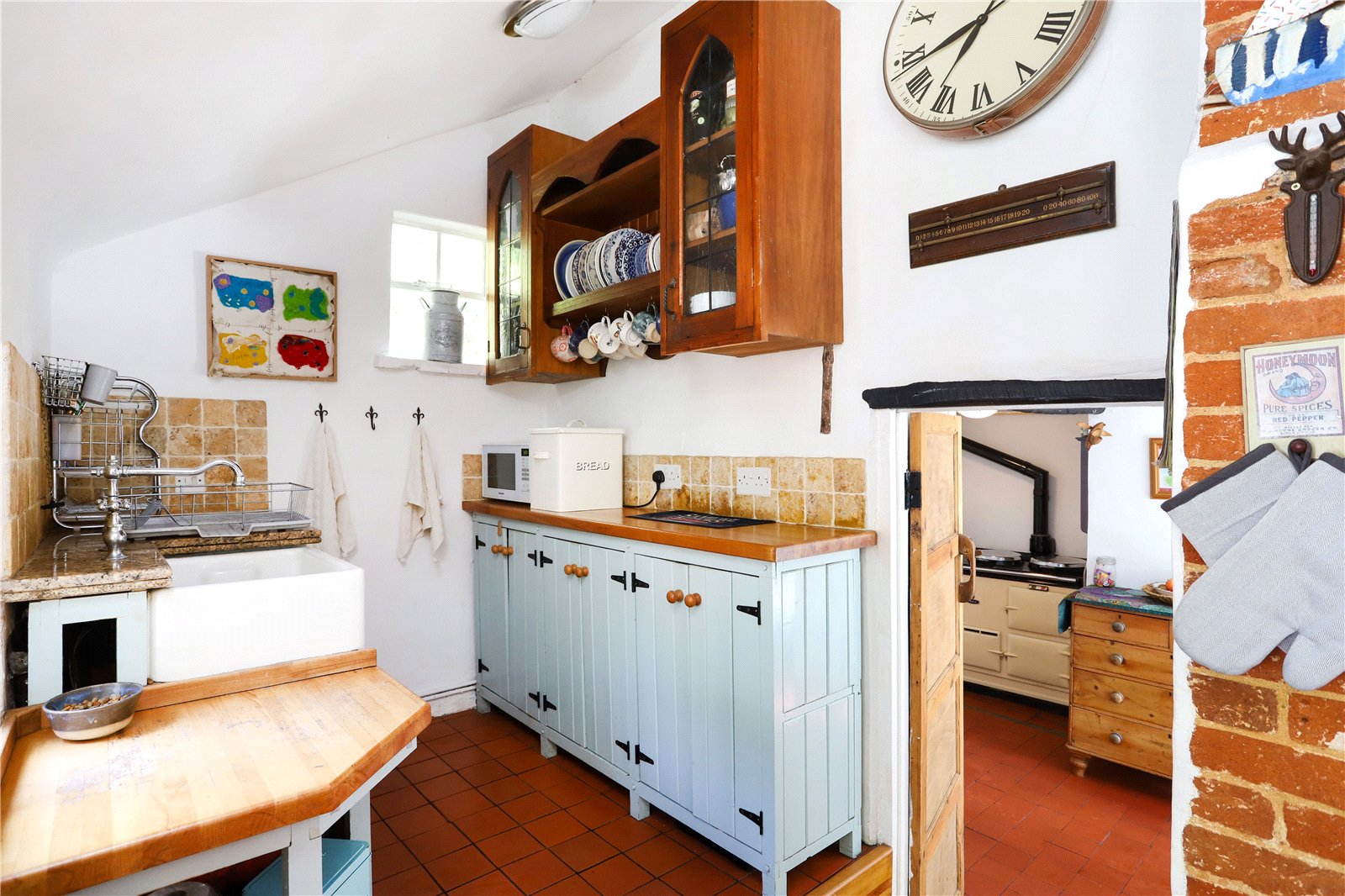 Kitchen Eye and base level cupboards, oak worktops, Belfast sink, plumbing for washing machine, space for fridge and freezer, exposed brickwork, casement door to outside.