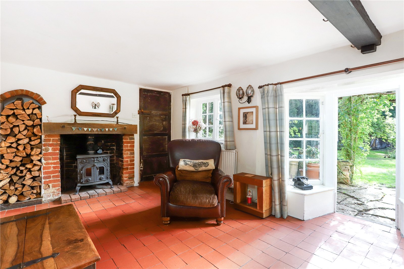 Sitting Room Double aspect, delightful outlook over garden, fireplace housing log burner and mantle over, staircase to first floor, understairs cupboard, casement door to garden.