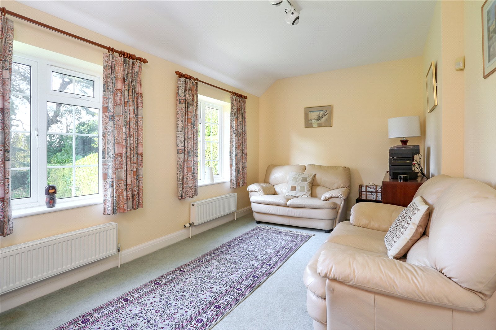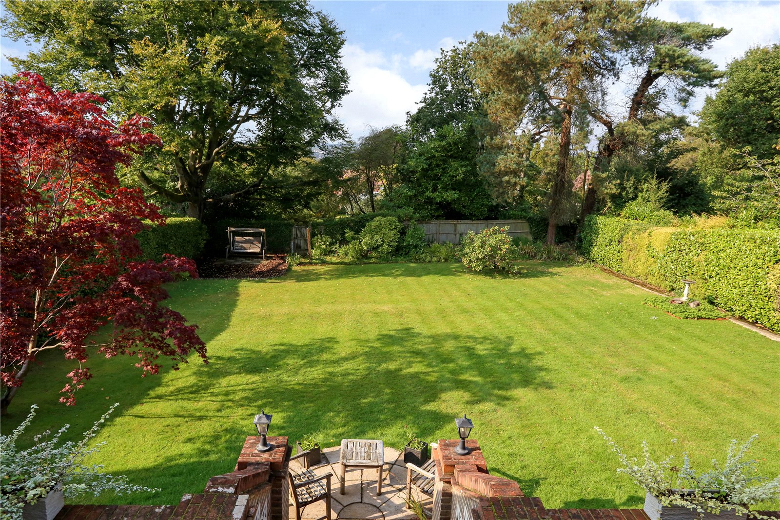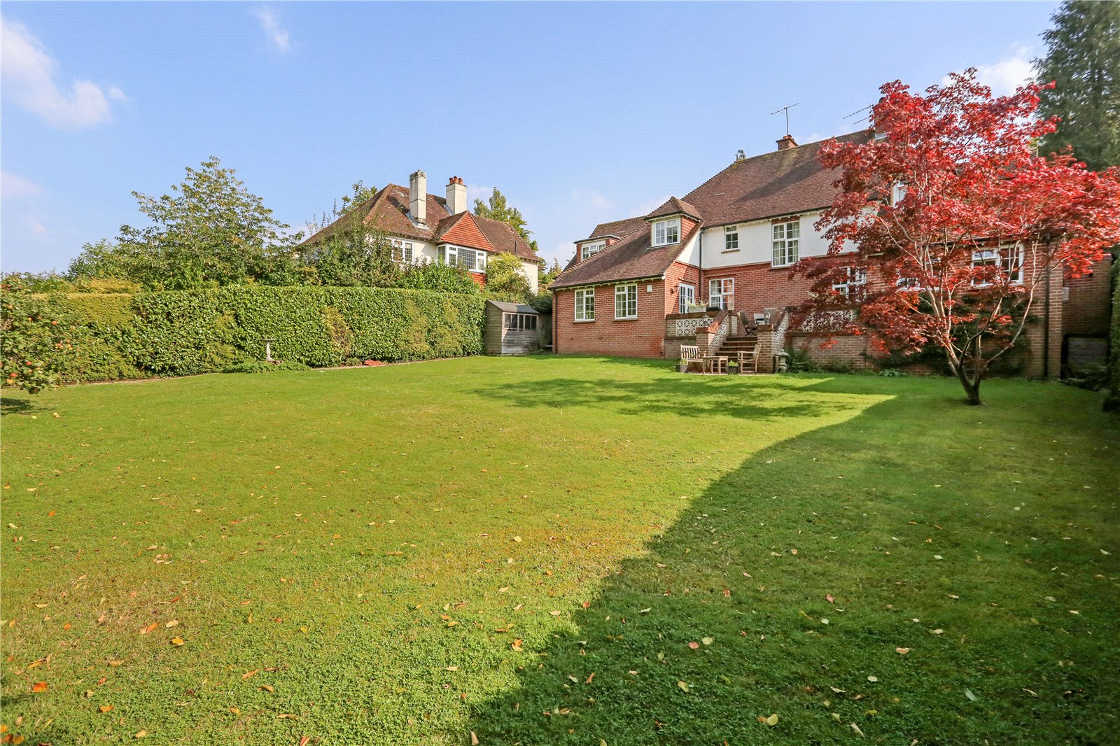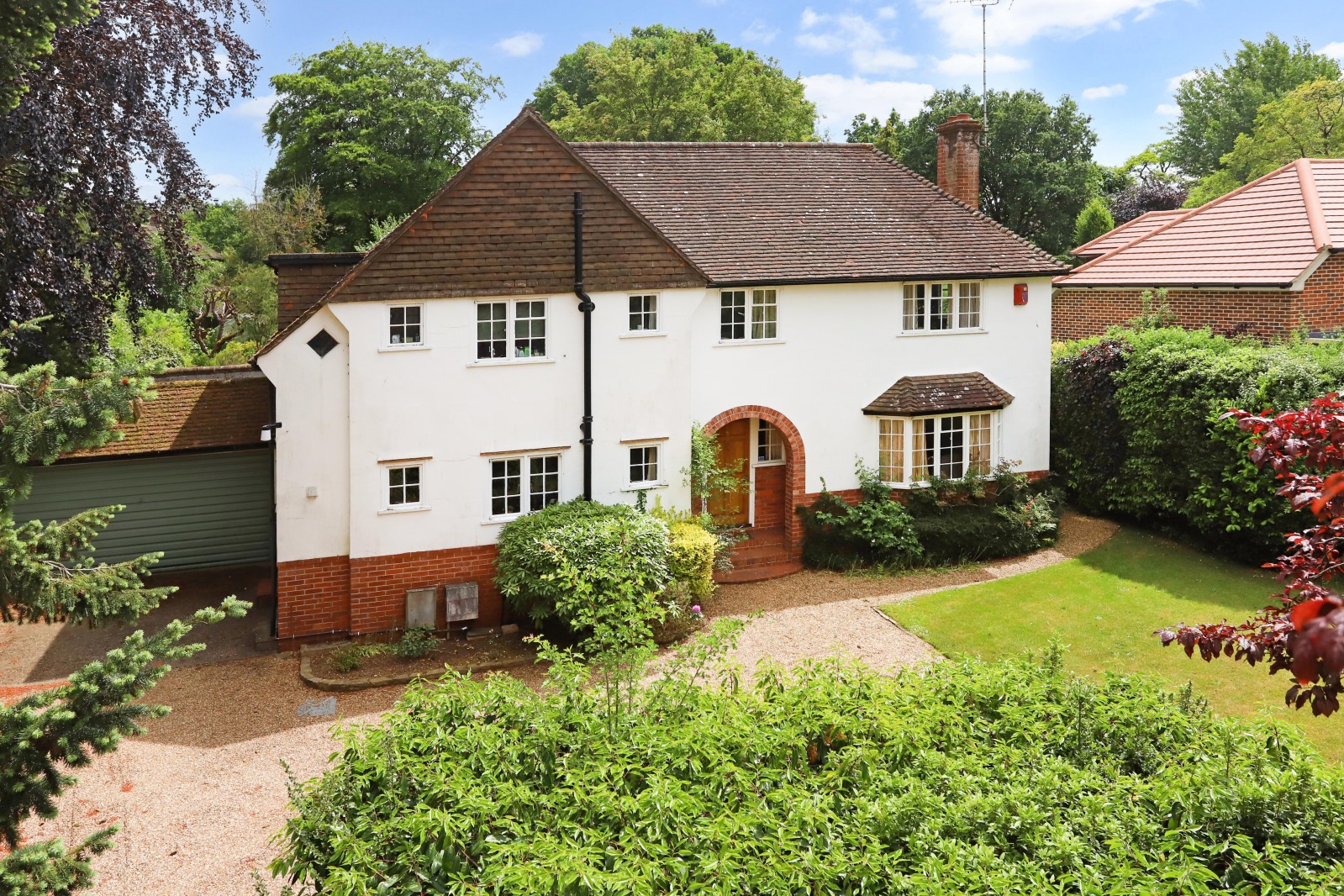 Outside The house is well positioned sitting centrally surrounded by its gardens on circa 0.4 acres. The house is approached via a long private drive located on the left boundary leading to the double garage. The front lawned garden offers privacy and seclusion with a mature hedgerow from Shortheath Road.