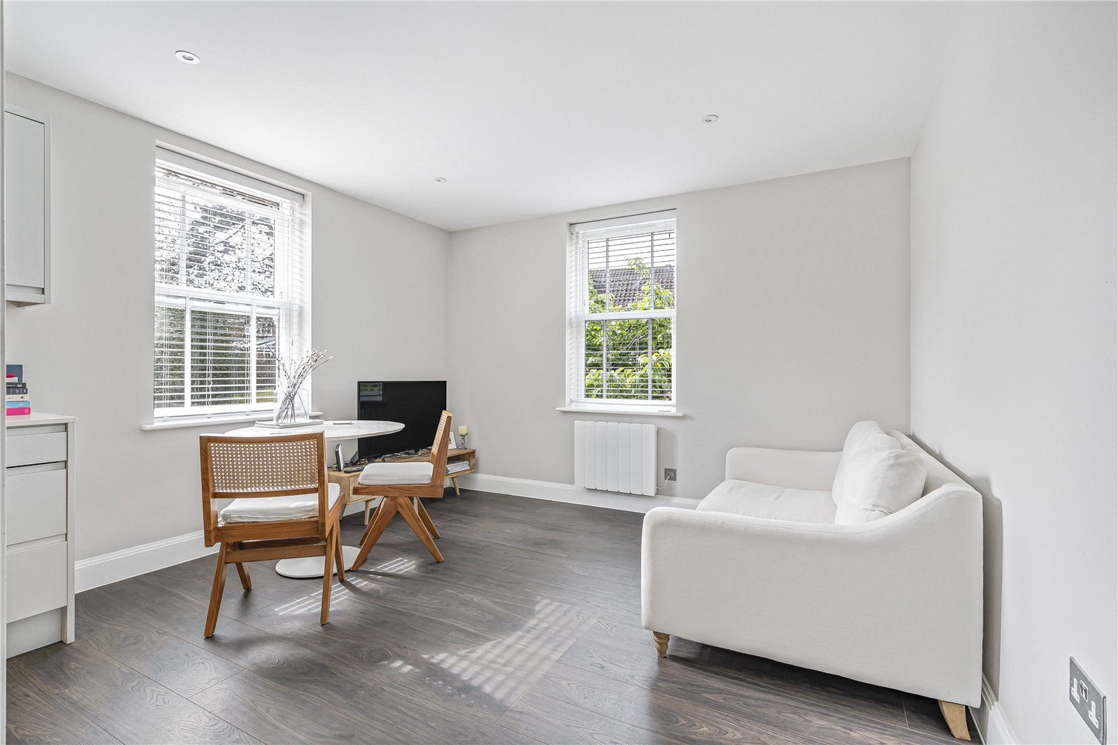 Located in the heart of central Weybridge, this beautifully presented two-bedroom, two-bathroom apartment offers contemporary living at its finest. Finished to a high standard throughout, the flat features a spacious open-plan living area with sleek modern fittings, perfect for entertaining or relaxing in comfort. The polished kitchen is fully integrated with AEG and quartz tops with ample storage space throughout.