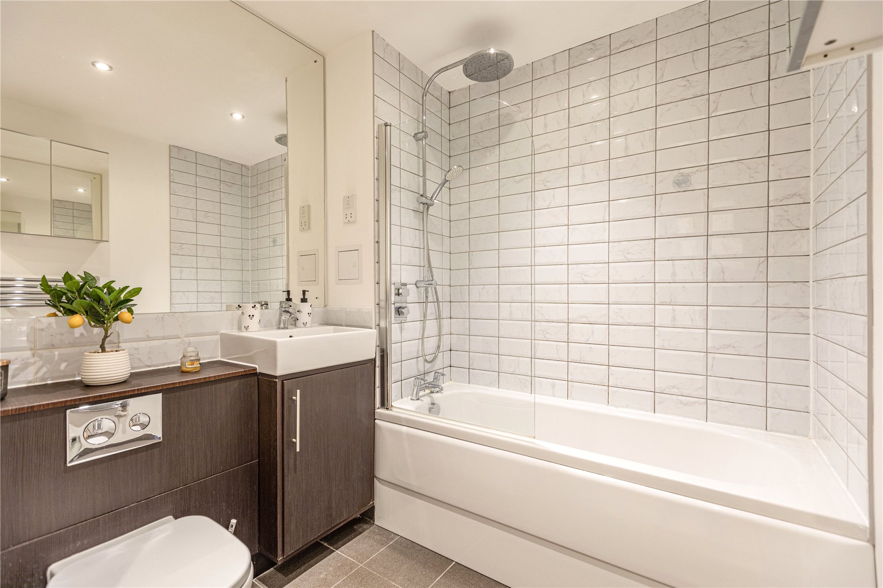 The excellent-sized double bedroom benefits from a full-length window and soft carpeted flooring for added comfort. Completing the apartment is a contemporary bathroom, featuring a stylish three-piece brown suite, a concealed cistern, part-tiled walls, a large mirror, and a shower over the bath.