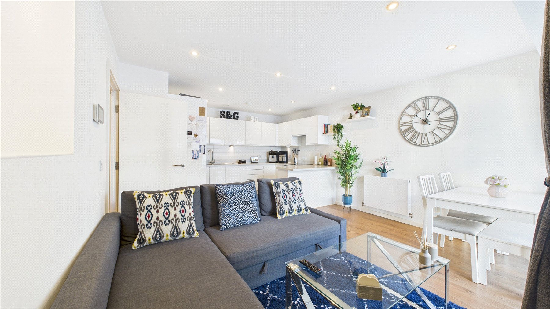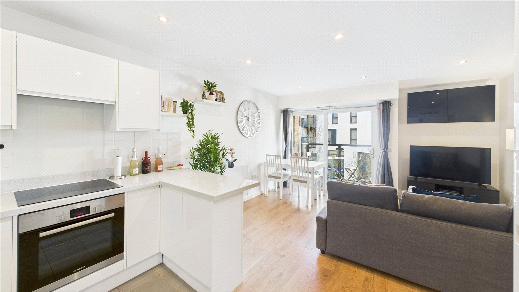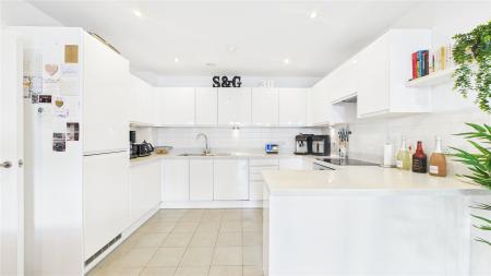 The accommodation boasts a bright and spacious open-plan living area, designed for modern living. The sleek kitchen is fitted with high-gloss white eye and base-level units, complemented by a light-coloured worktop, breakfast bar, tiled flooring, tiled splashback, and an integrated oven and hob and dishwasher.