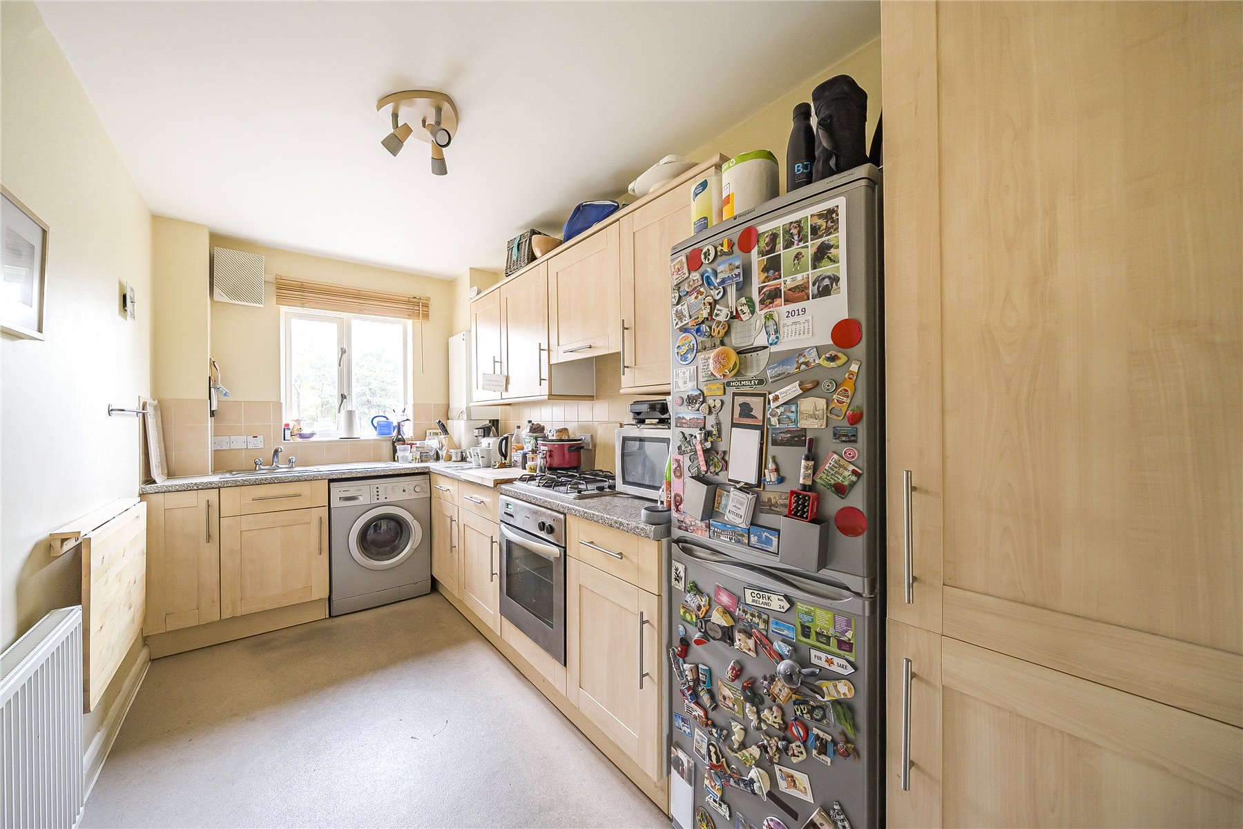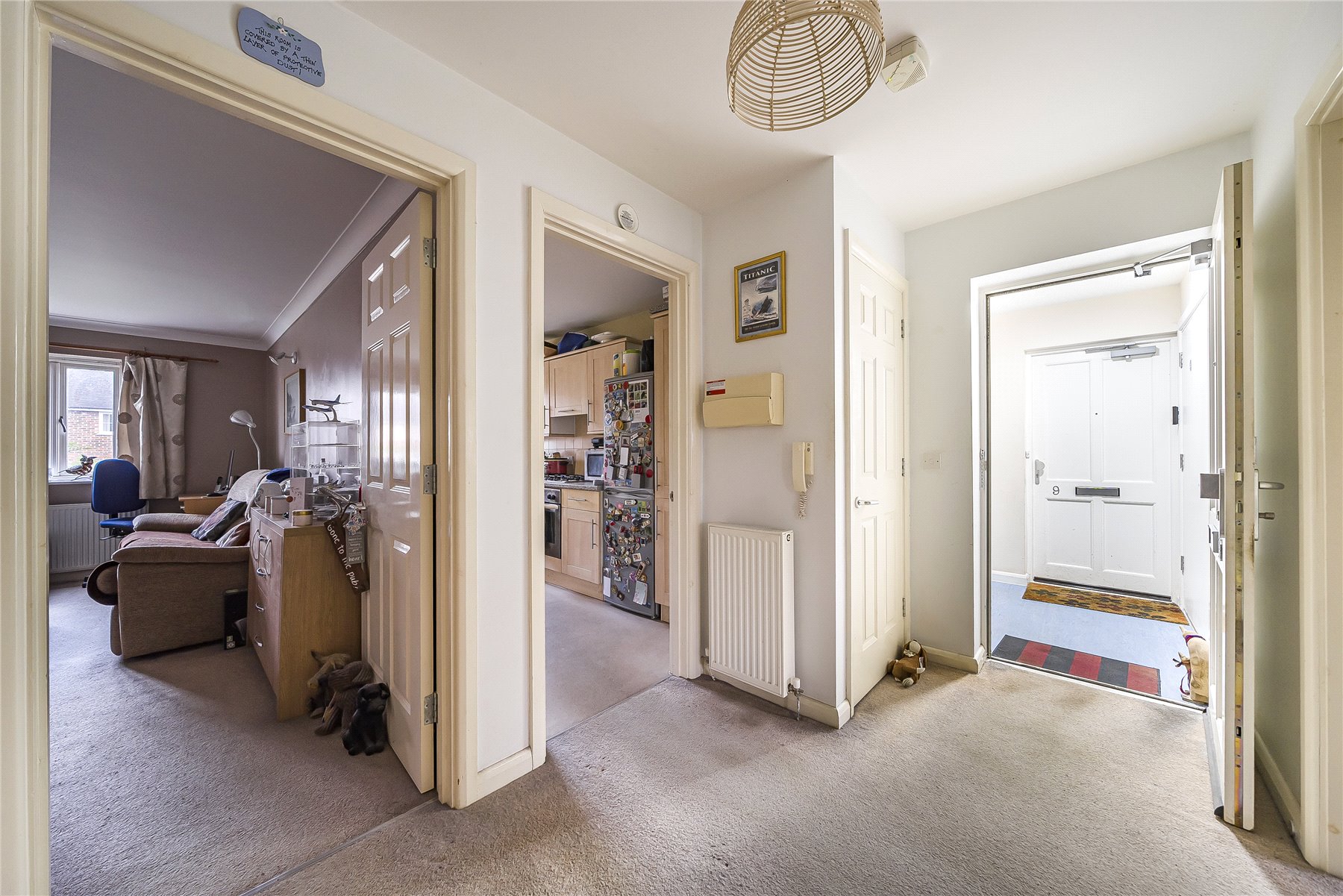 The front door opens into a generous hallway providing access to all the accommodation and built-in storage. The kitchen is fitted with a good range of base and eye level units and includes a useful wall-mounted folding table. There is space available for large domestic appliances in addition to an integrated oven and hob. The bright sitting/dining room is spacious and boasts double aspect windows. The larger of the two double bedrooms has built in storage, and the bathroom has been fitted with a modern white suite comprising a bath with an overhead shower, hand basin and WC.