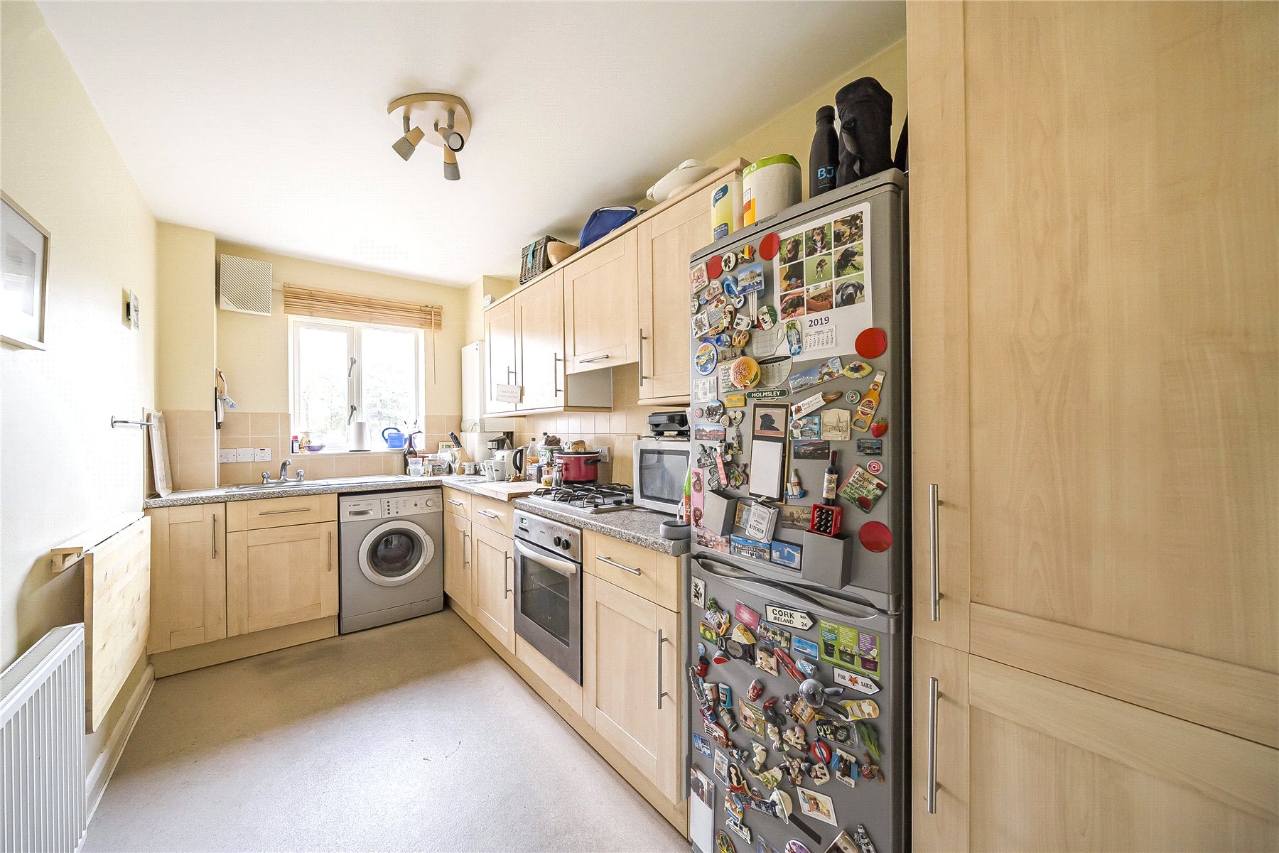 The front door opens into a generous hallway providing access to all the accommodation and built-in storage. The kitchen is fitted with a good range of base and eye level units and includes a useful wall-mounted folding table. There is space available for large domestic appliances in addition to an integrated oven and hob. The bright sitting/dining room is spacious and boasts double aspect windows. The larger of the two double bedrooms has built in storage, and the bathroom has been fitted with a modern white suite comprising a bath with an overhead shower, hand basin and WC.