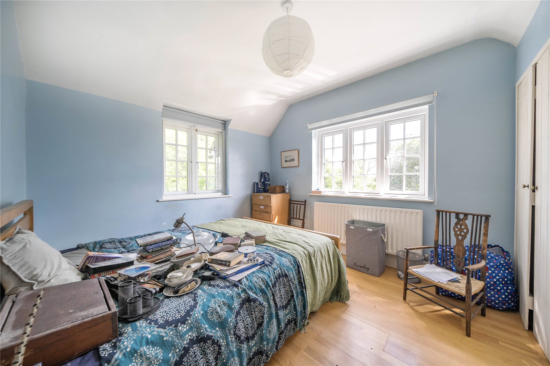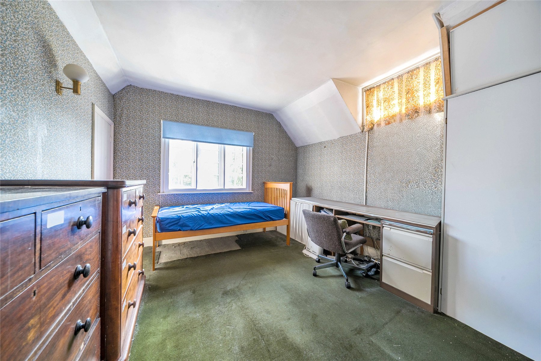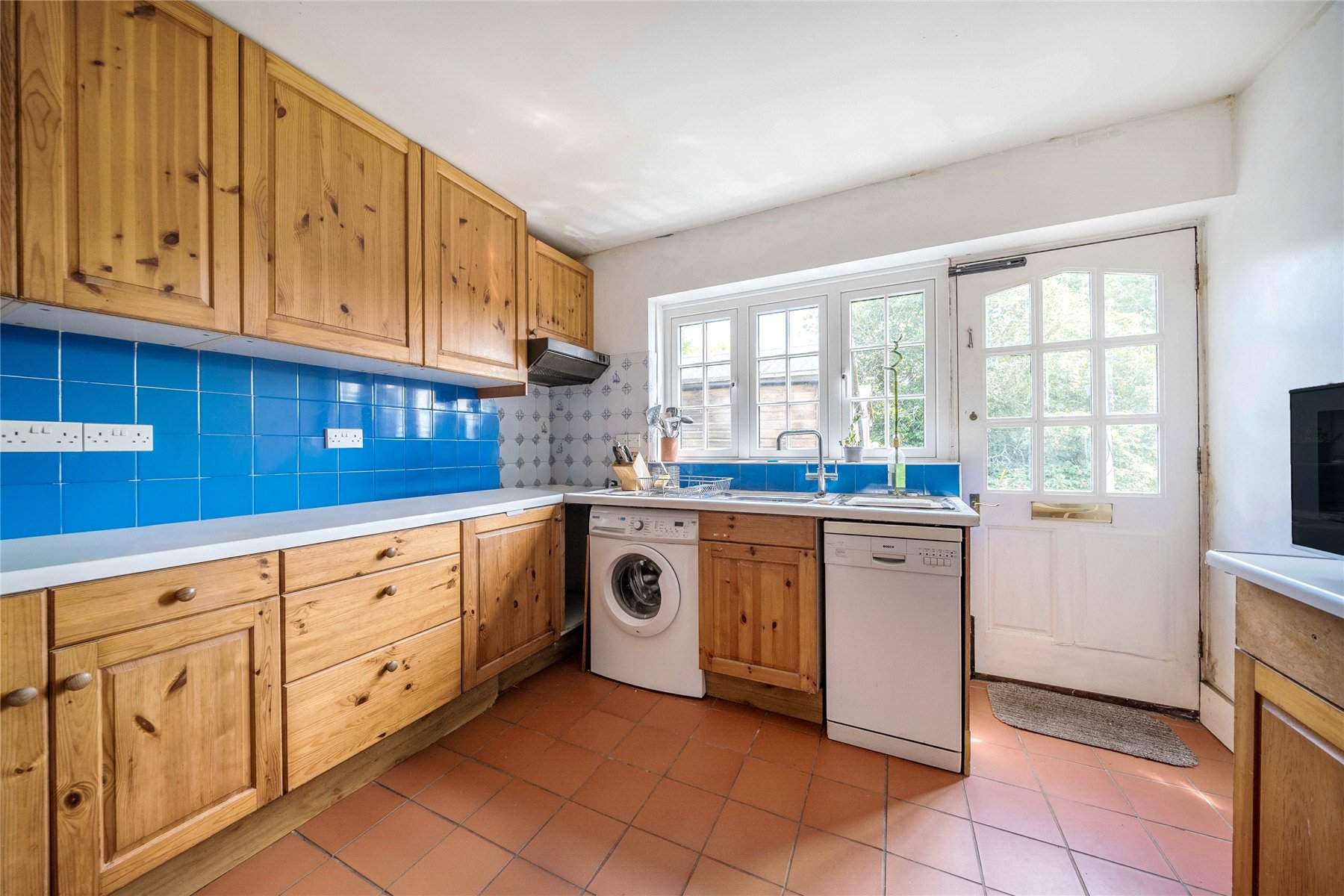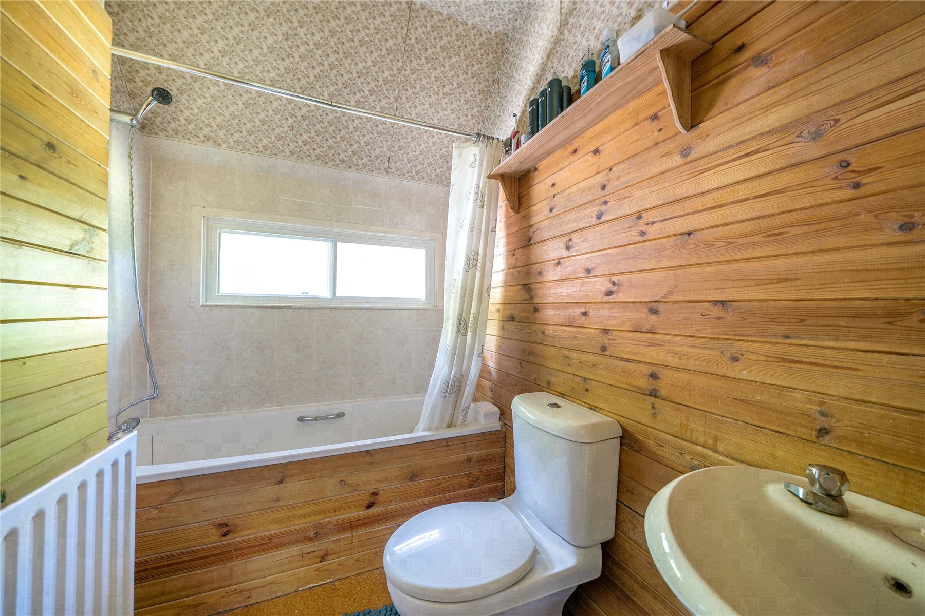 On the first floor there are three bedrooms, two large double bedrooms which benefit from built-in storage and a smaller single room. The bathroom is dated and in need updating.