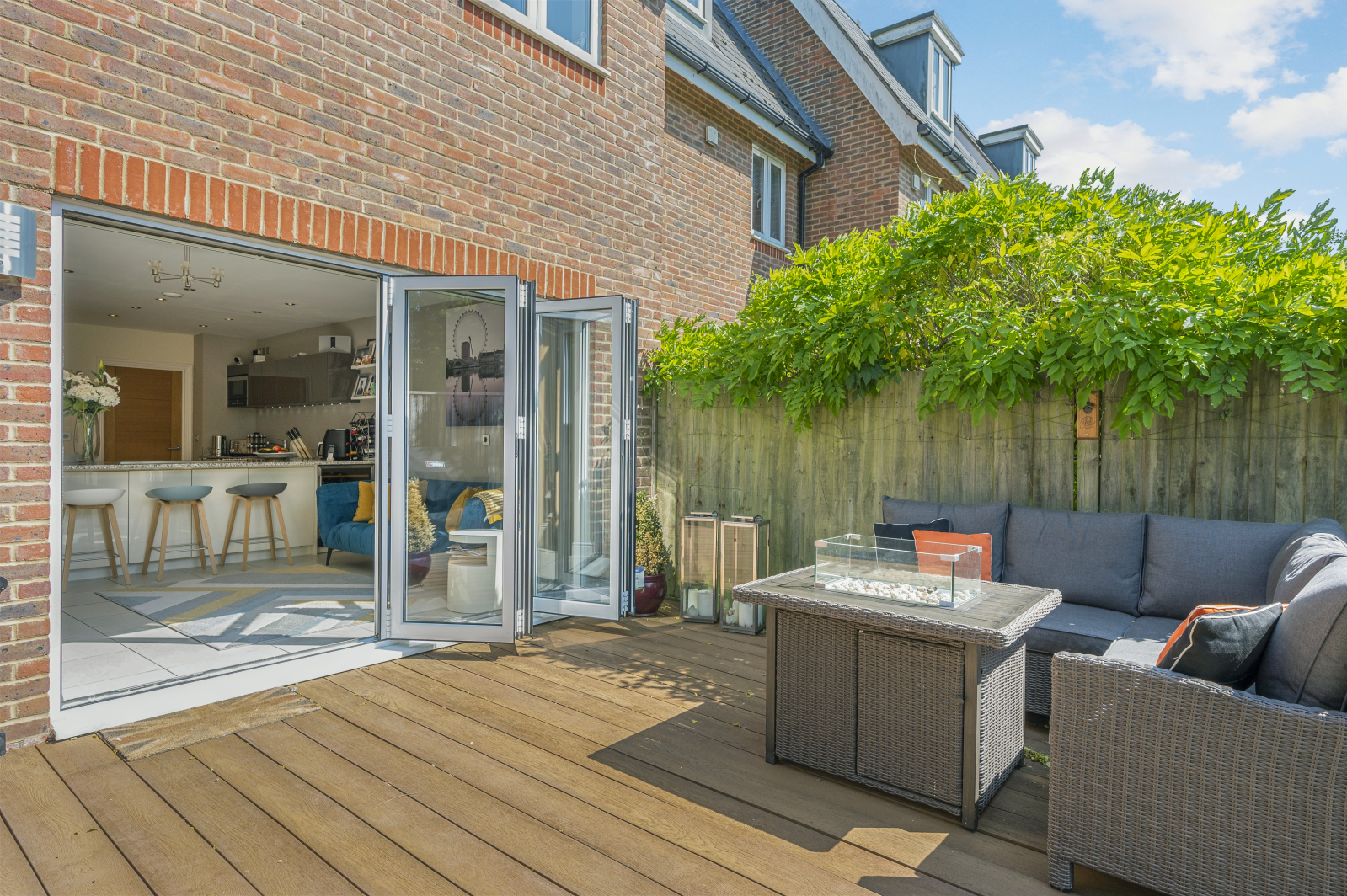 The expansive living room offers a warm and welcoming space to unwind, while the bright and airy kitchen/dining area enhanced by sleek bi-folding doors opens directly onto a west-facing garden, ideal for entertaining and enjoying the afternoon sun.
