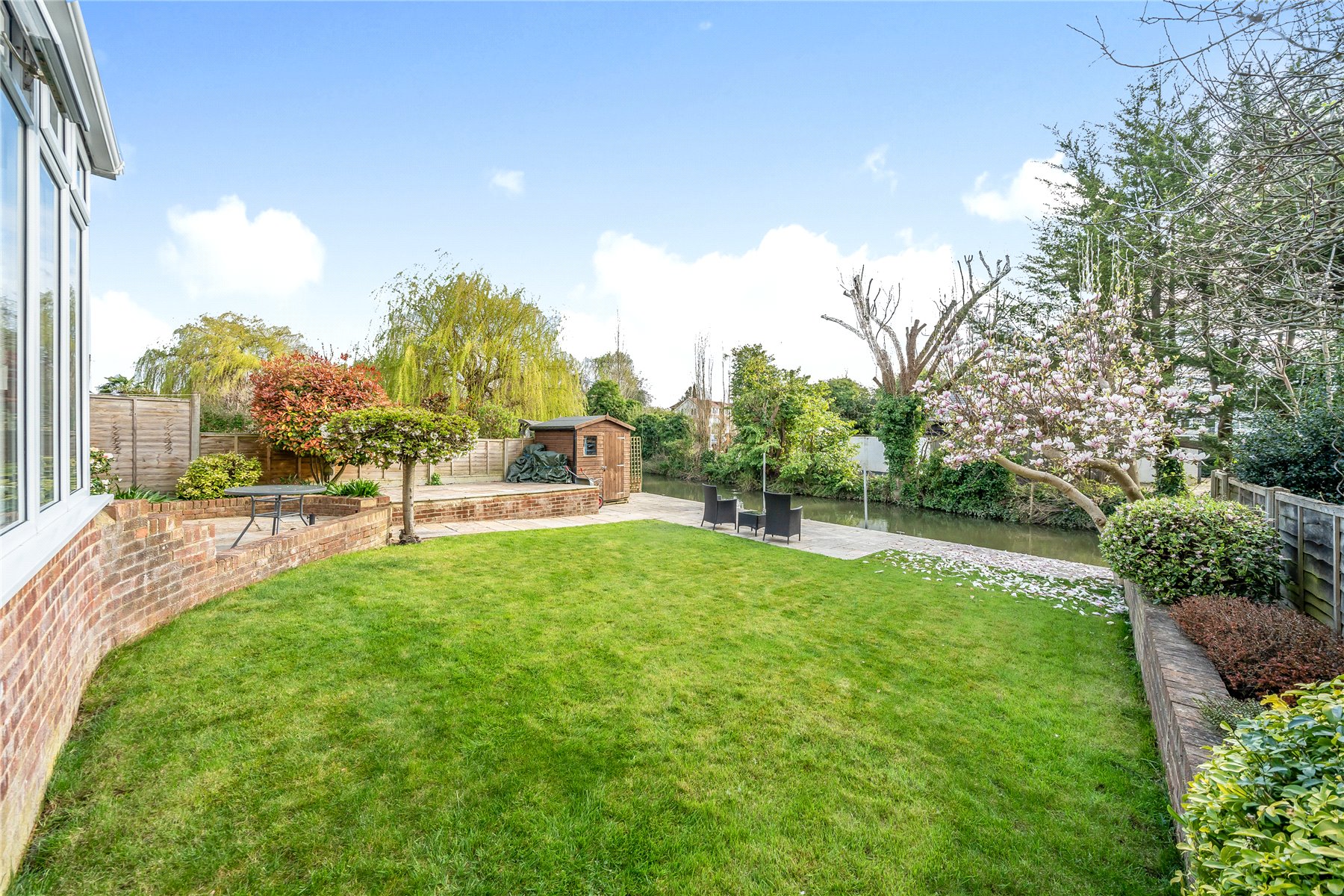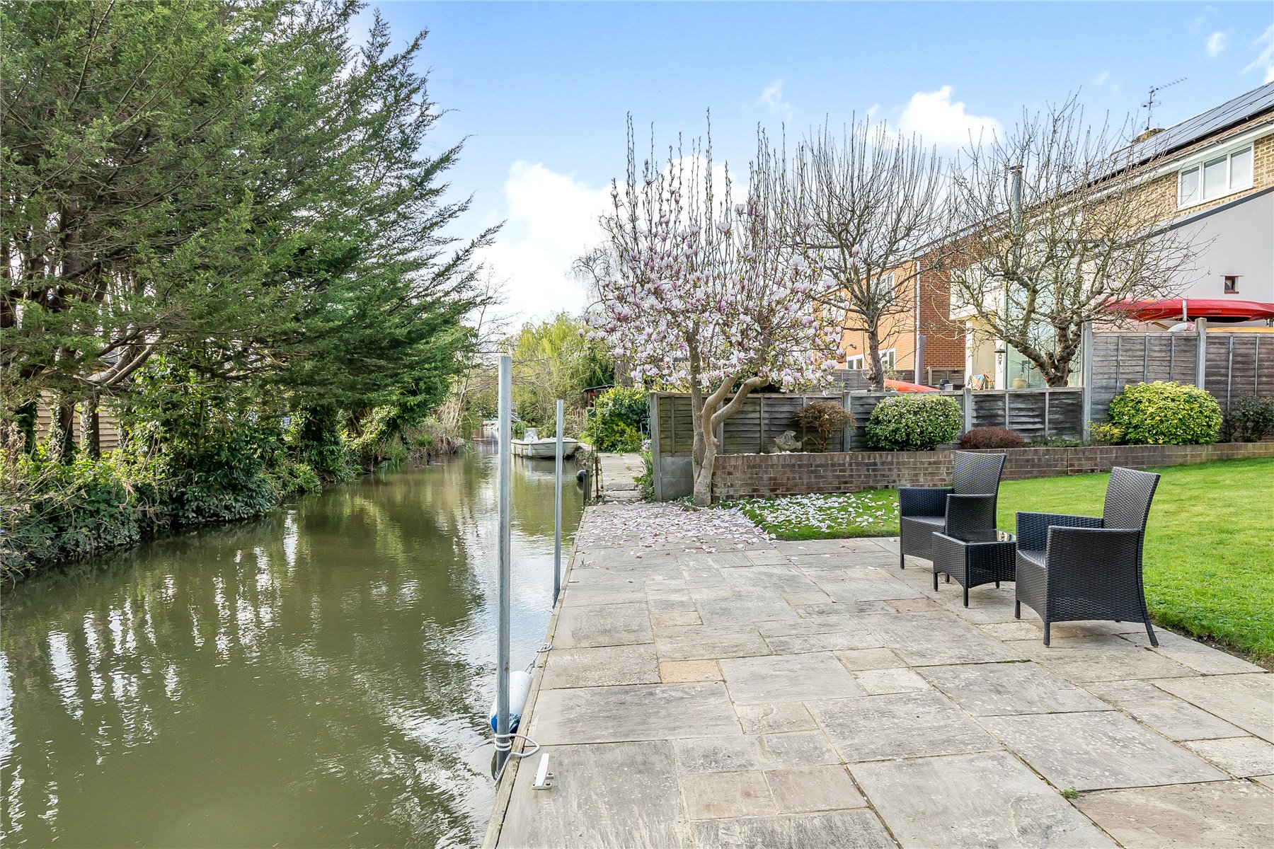 Backing onto the River Thames backwater is this well presented detached family home offering spacious accommodation throughout. Features include a private mooring (suitable for a 20' boat), well appointed living room, separate formal dining room, modern fitted kitchen/breakfast room, downstairs cloakroom, four bedrooms with en suite to master bedroom, family bathroom, tranquil and private riverside garden and ample gated parking for three to four cars.