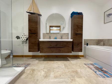EN-SUITE 5' 11" x 14' 2" (1.82m x 4.34m) Vaulted ceiling, inset LED lighting, tiled ceramic flooring, stainless steel heated towel rail, fitted with a four piece suite comprising low level WC, double wash hand basin fitted into vanity unit with storage below with 2 rainfall shower taps, tiled splashbacks and mirror over, bath with central waterfall mixer tap, fully tiled shower enclosure with fitted thermostatic shower over. Further cupboards matching vanity unit.