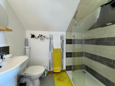 EN-SUITE 4' 7" x 7' 3" (1.40m x 2.21m) Inset LED lighting, sloping ceiling, stainless steel heated towel rail, extractor fan, fitted with a three piece suite comprising low level WC, pedestal wash hand basin with mixer tap and tiled splashbacks, walk-in shower enclosure with shower screen with thermostatic shower over.
