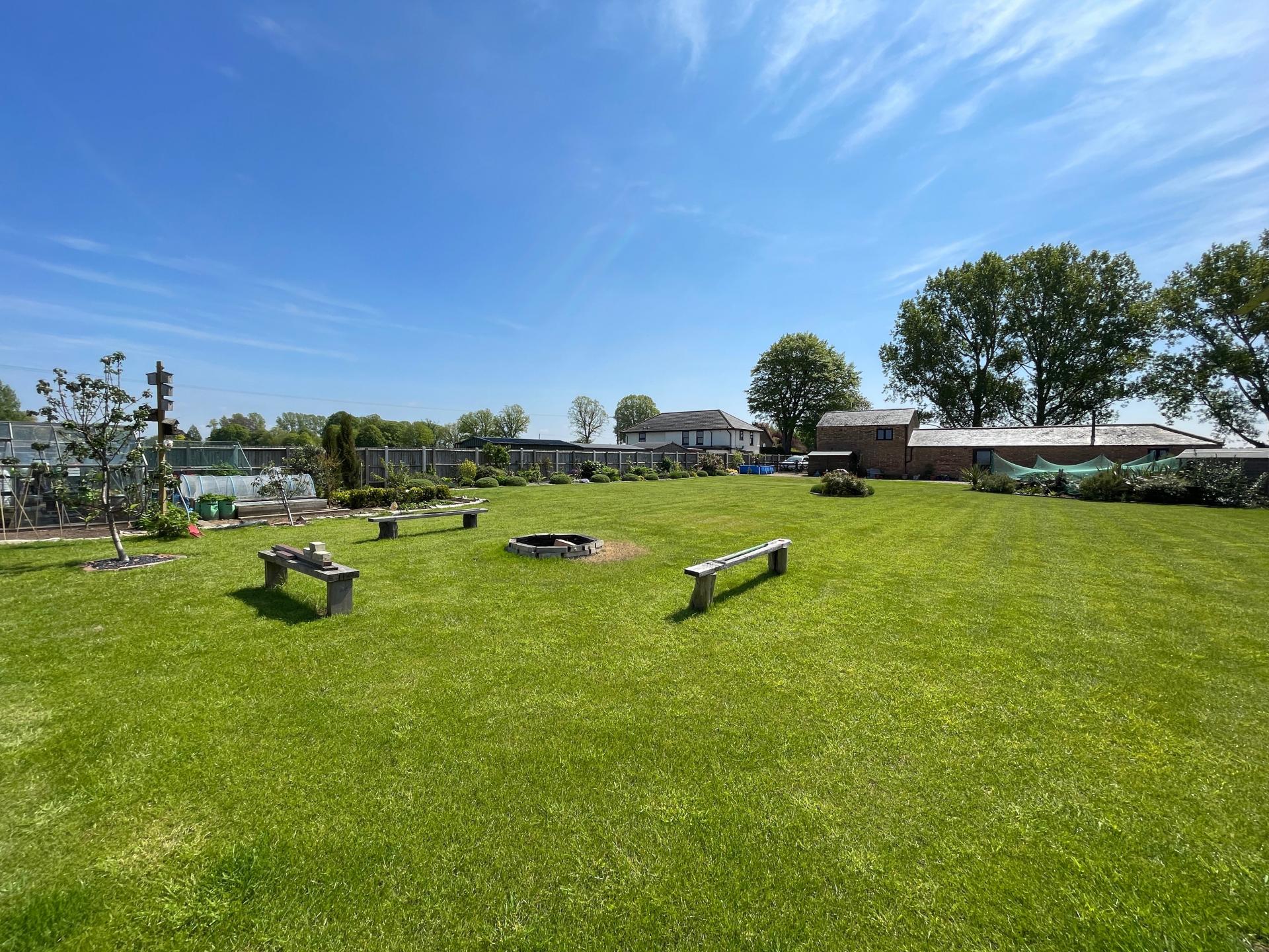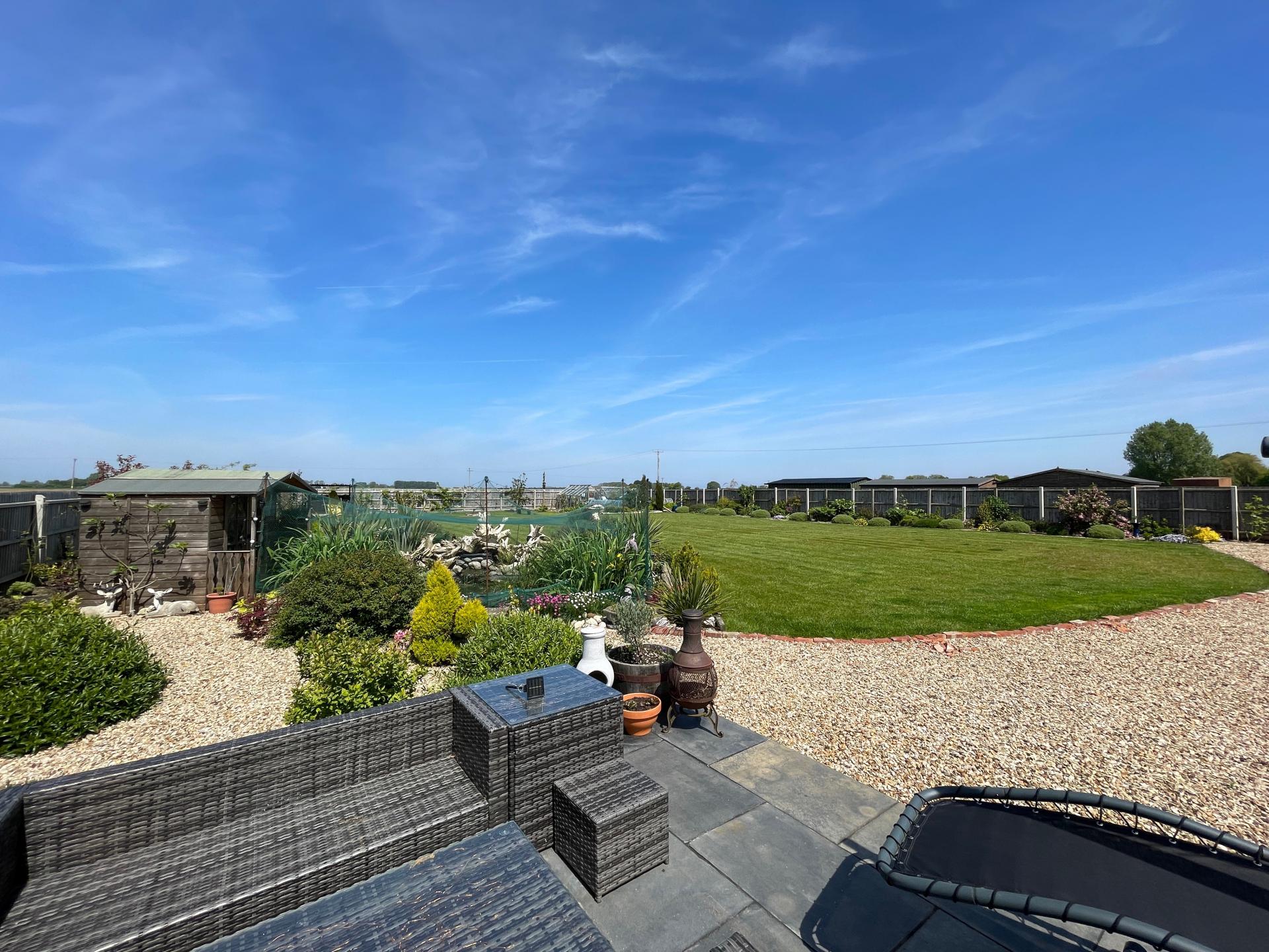 REAR GARDEN Extensive gravelled area, slate patio, cold water tap, external lighting, wooden built summerhouse, pond with filter, pump and raised rockery area. The garden is mainly laid to lawn with a wide range of mature shrub and tree borders. 2 wooden garden sheds, further shelter area, 2 glasshouses, vegetable patch. Fenced boundaries to both sides and to the rear elevation. Field views beyond.