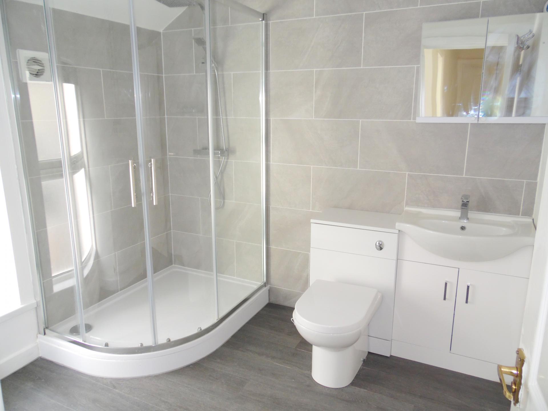 BATHROOM: Upvc double glazed window to the side. Refitted modern white wc, hand basin plus tiled and glazed shower cubicle with dual head shower unit. Tiled splashbacks.