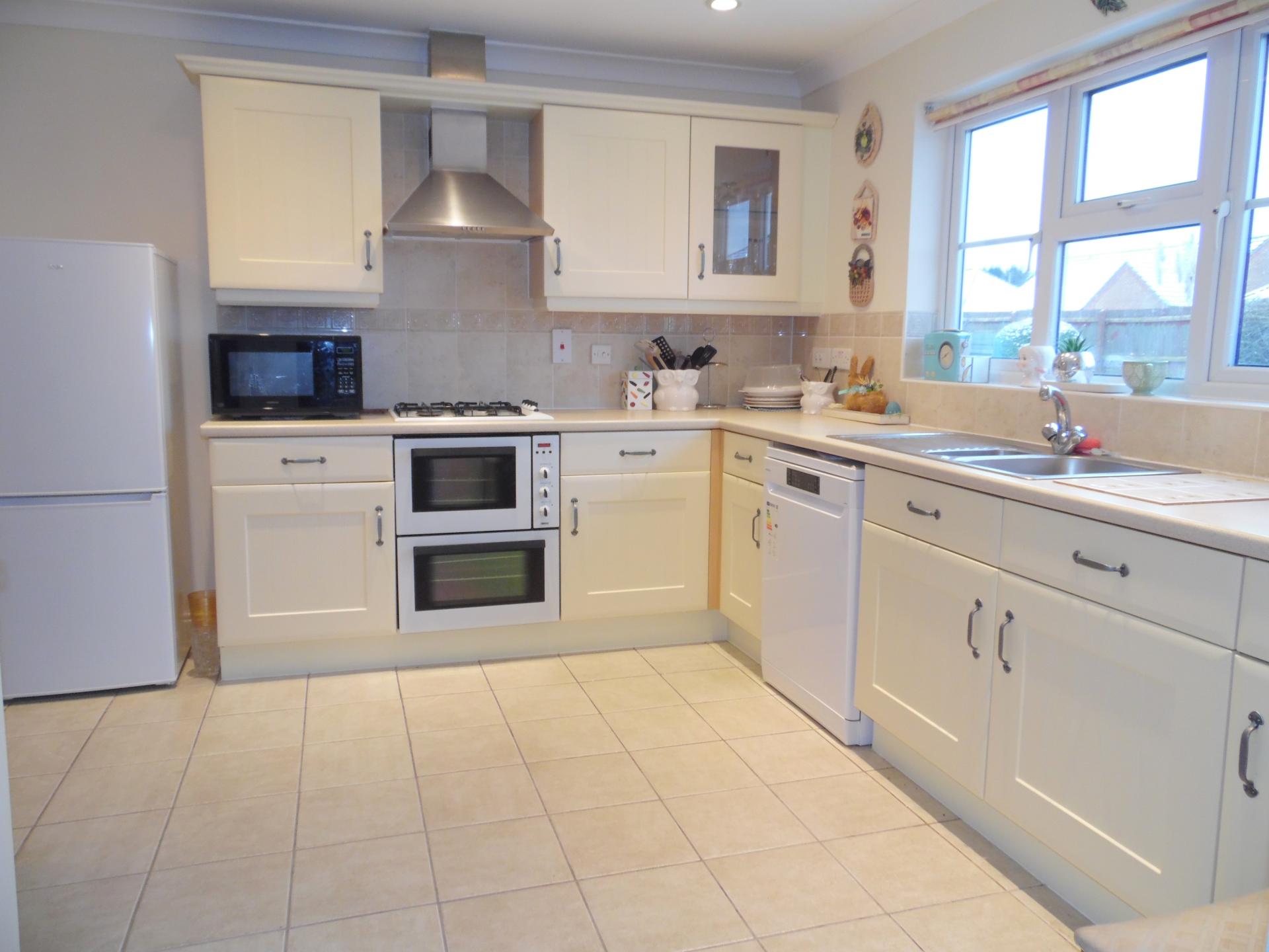 Upvc double glazed window to the rear. Fitted base units with work tops over and matching wall units. Integrated double oven, hob and extractor. Space for dishwasher and tall fridge/freezer. Inset stainless steel sink and drainer with mixer tap. Tiled splash backs. Tiled floor. Door to: