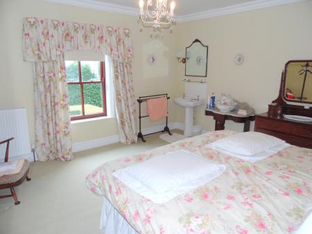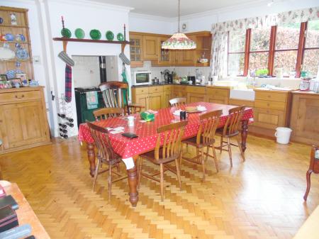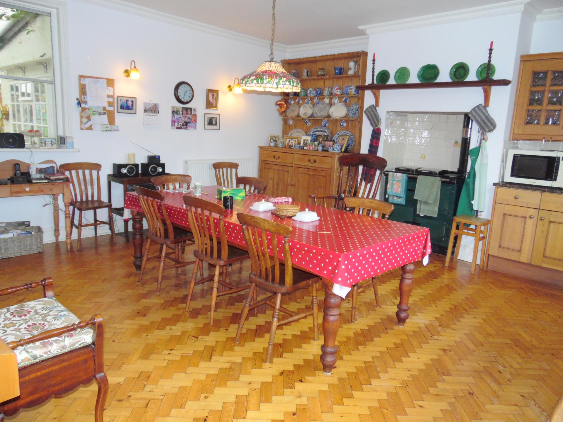 Dual aspect with windows to both sides (one internal to the sun room). Fitted solid wood base units with work tops over and matching wall units. Inset butler sink with mixer tap over and drainer incorporated into the work top. Chimney recess with inset oil fired Rayburn range cooker also serving part central heating and hot water. Parquet wood flooring. Radiator. Tiled splash backs. 2 Wall lighting points. Feature coving and ceiling rose to ceiling.