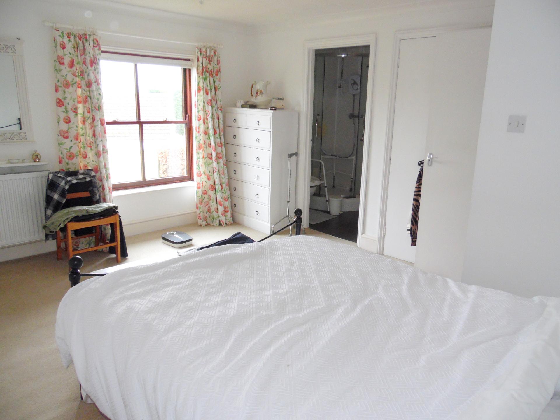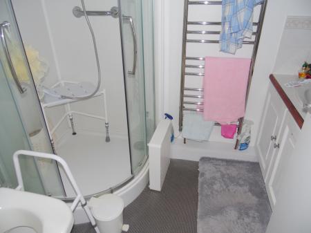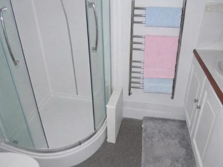 EN-SUITE SHOWER ROOM: Window to the side. Fitted white shower cubicle, wc plus hand basin set to vanity unit. Tiled splash back. Chrome heated towel rail.