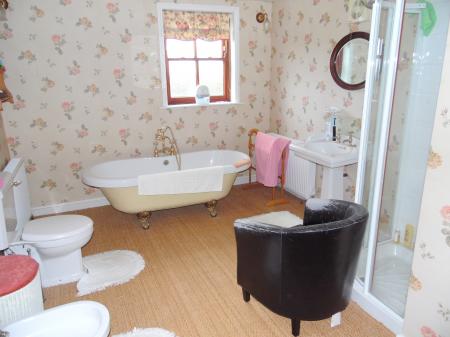 BATH/SHOWER ROOM: Dual aspect with windows to the front and side. Period style modern white suite comprising wc, hand basin, bidet, tiled and glazed shower cubicle plus roll top claw feet bath with shower mixer tap. 2 Wall lighting points. 2 Radiators. Built in airing cupboard.