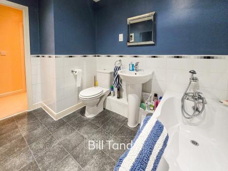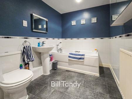 2.94m x 2.12m (9' 8" x 6' 11") having radiator, suite comprising pedestal wash hand basin with tiled surround, low flush W.C. and bath with shower head attachment.