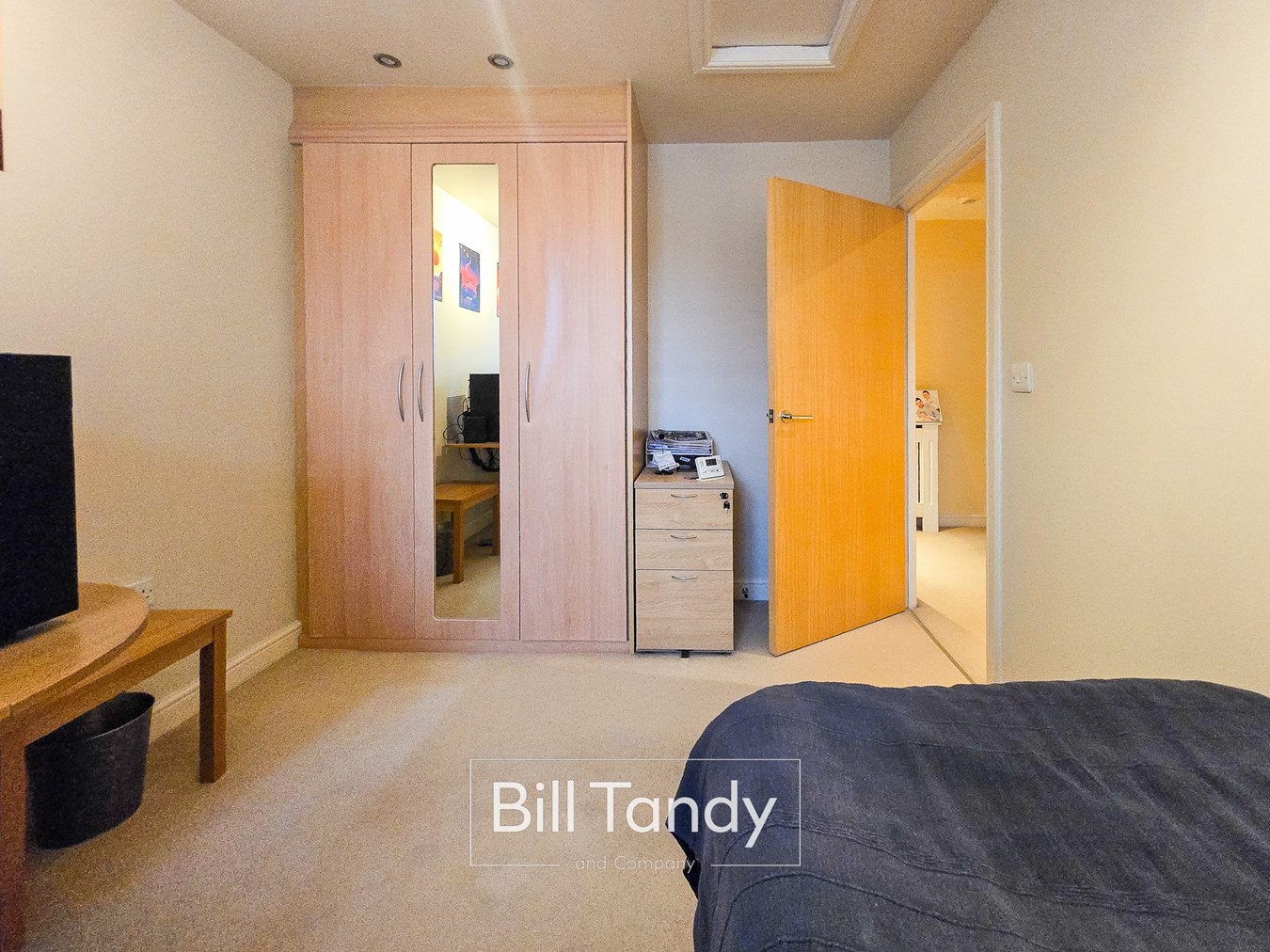 3.83m x 2.73m (12' 7" x 8' 11") having double glazed window to side, radiator, fitted wardrobes, ceiling light point, spotlighting and loft access.