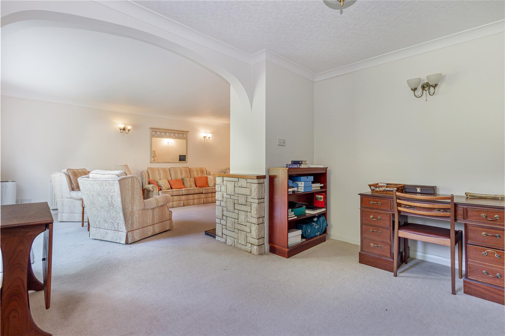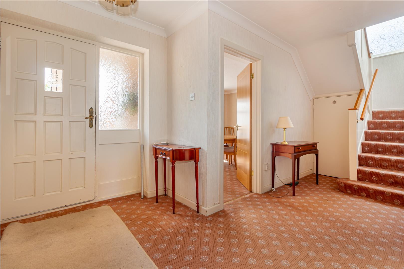 Hall - The hallway is welcoming and spacious, providing access to the main rooms and the staircase to the first floor. It features neutral carpets and walls that complement the traditional style of the home.