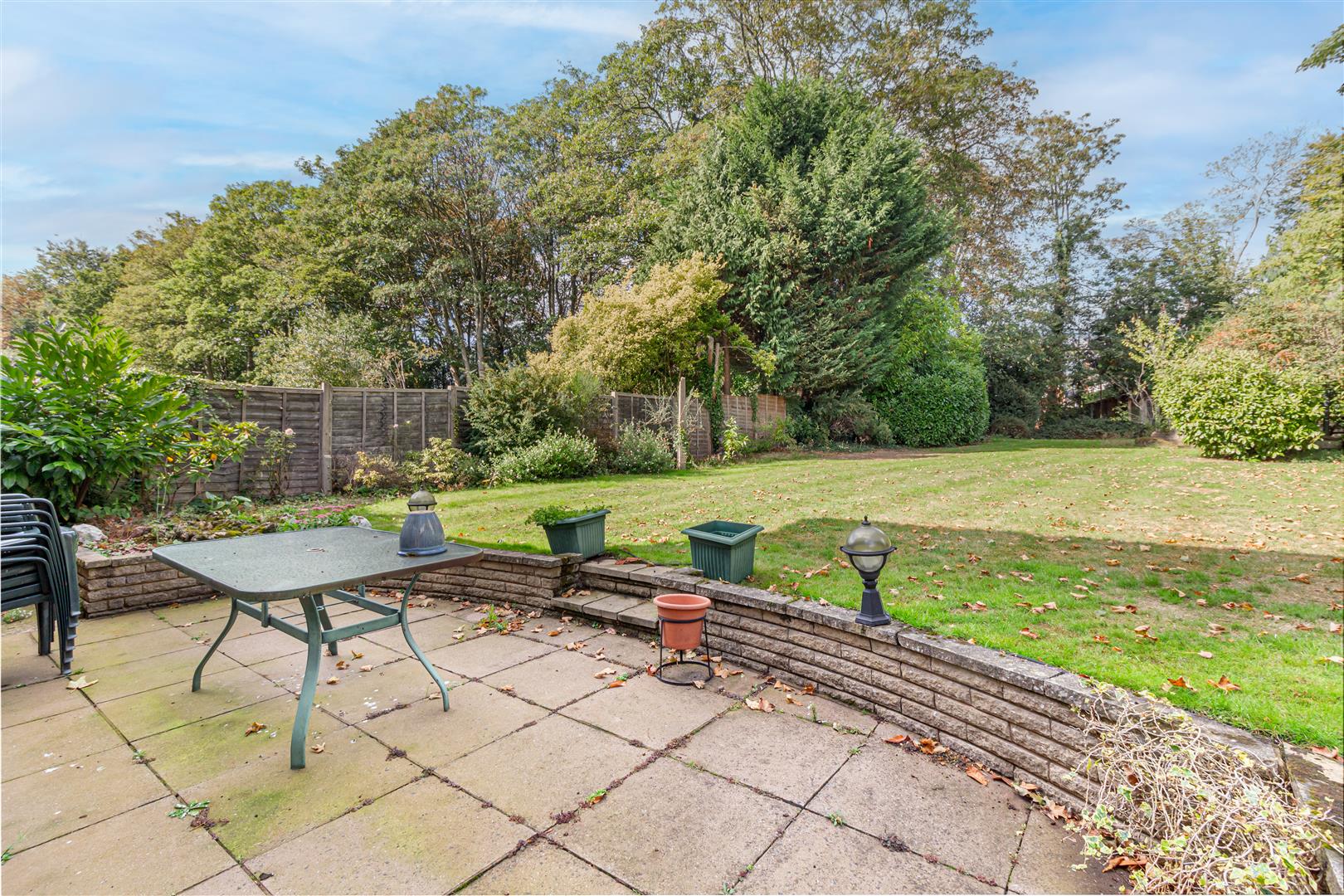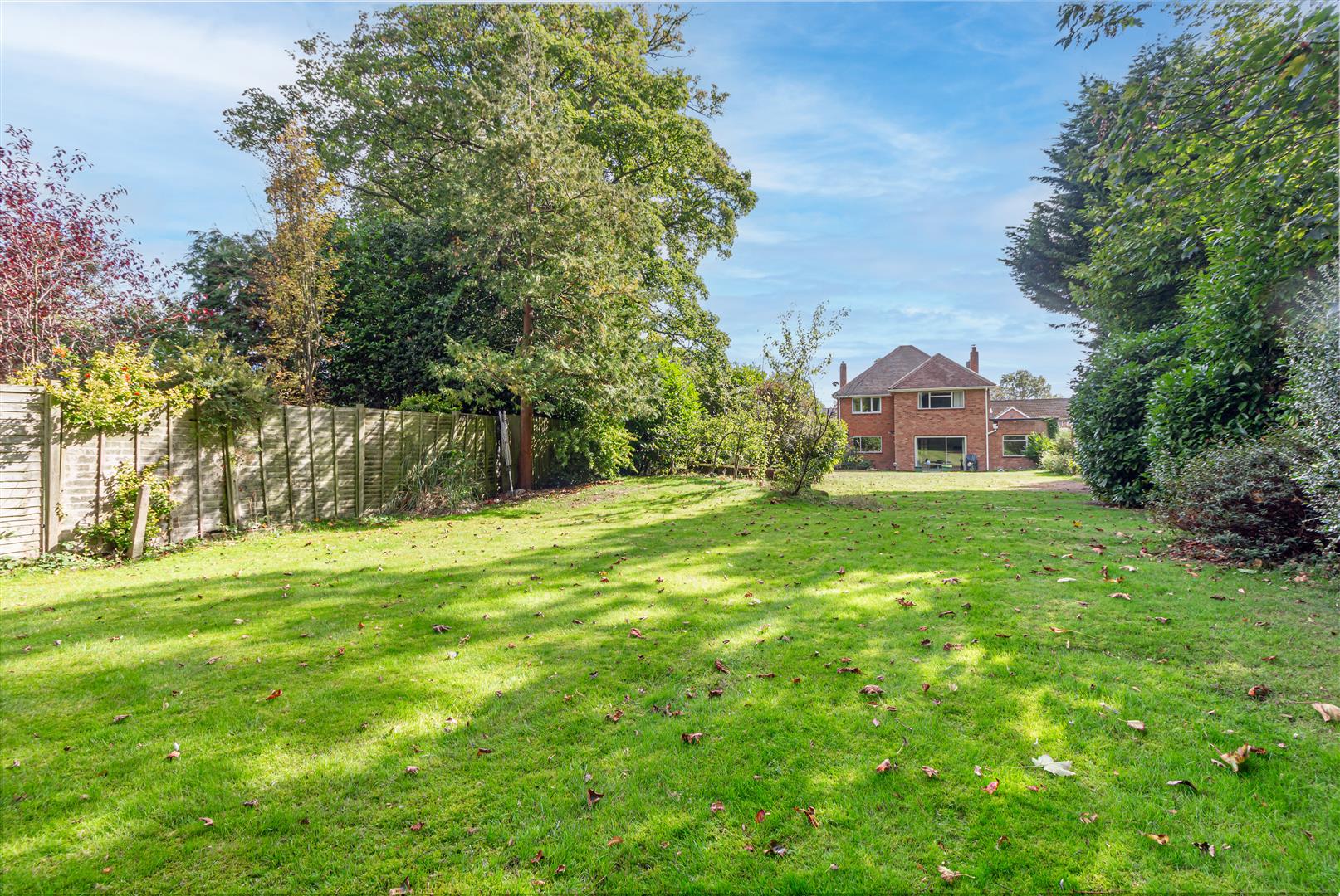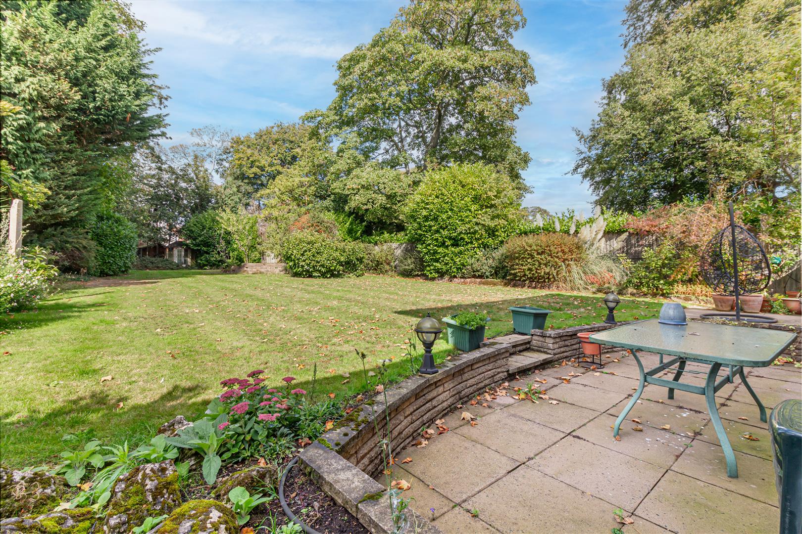 Rear Garden - The rear garden is a generous expanse of lawn bordered by mature trees and shrubs, creating a private and tranquil outdoor space. A paved patio area adjacent to the house offers an ideal spot for outdoor dining and relaxing while overlooking the beautifully maintained garden.