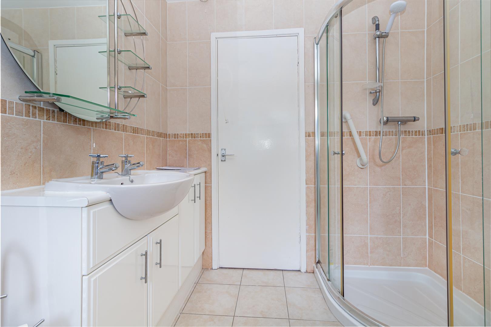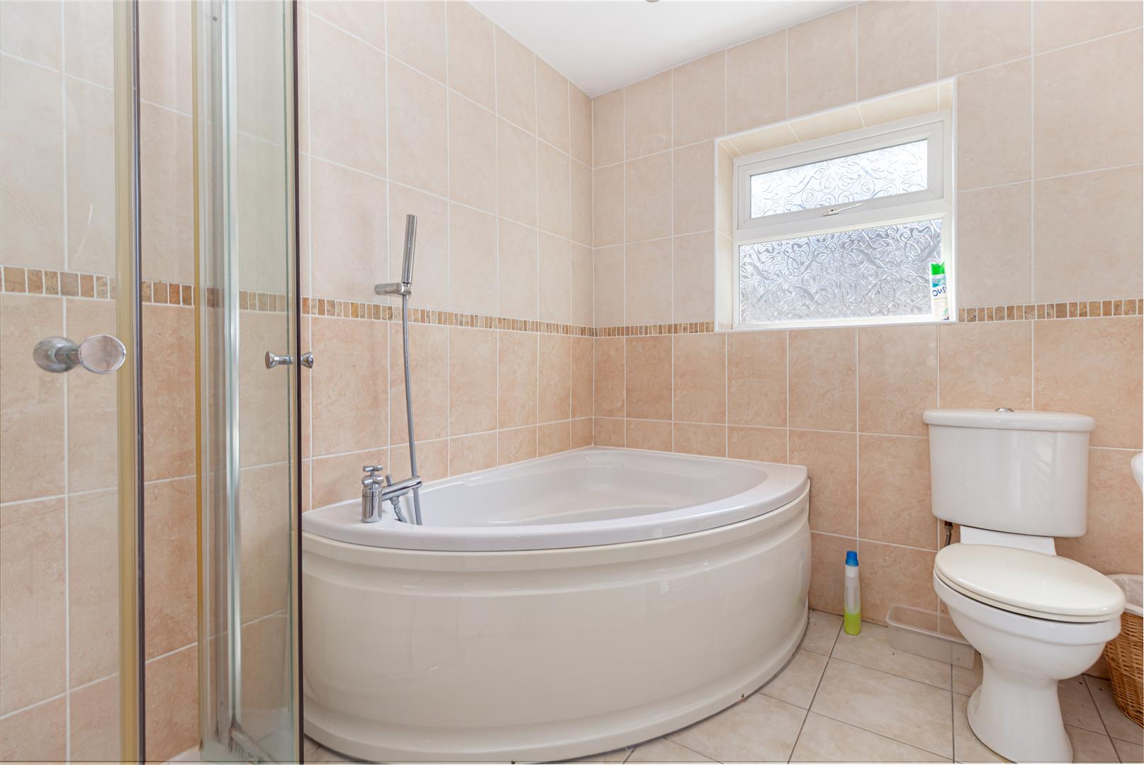 Bathroom - The main bathroom is fully tiled in neutral cream shades and features a corner bath alongside a separate shower cubicle, a toilet, and a wash basin with vanity storage beneath. A frosted window provides natural light and privacy.