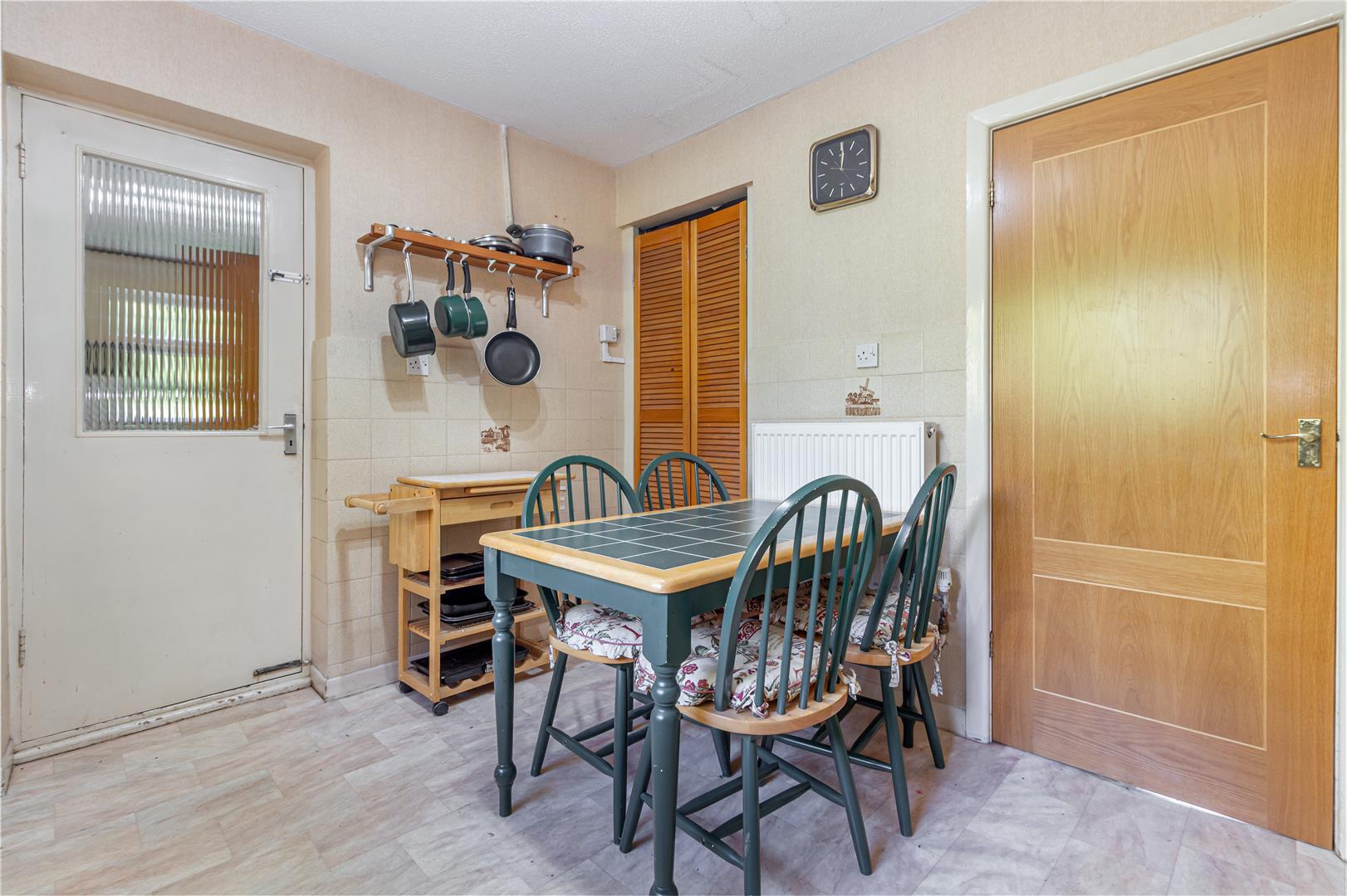 Kitchen/Breakfast Room - The kitchen/breakfast room is practical and well-proportioned, with light wood cabinetry and ample storage above and below the worktops. A window overlooking the garden lets in natural light, while the space comfortably accommodates a small dining table for casual meals. A door leads to the adjoining utility room, adding convenience. The kitchen benefits from space for a under counter fridge, freestanding cooker and a useful storage cupboard