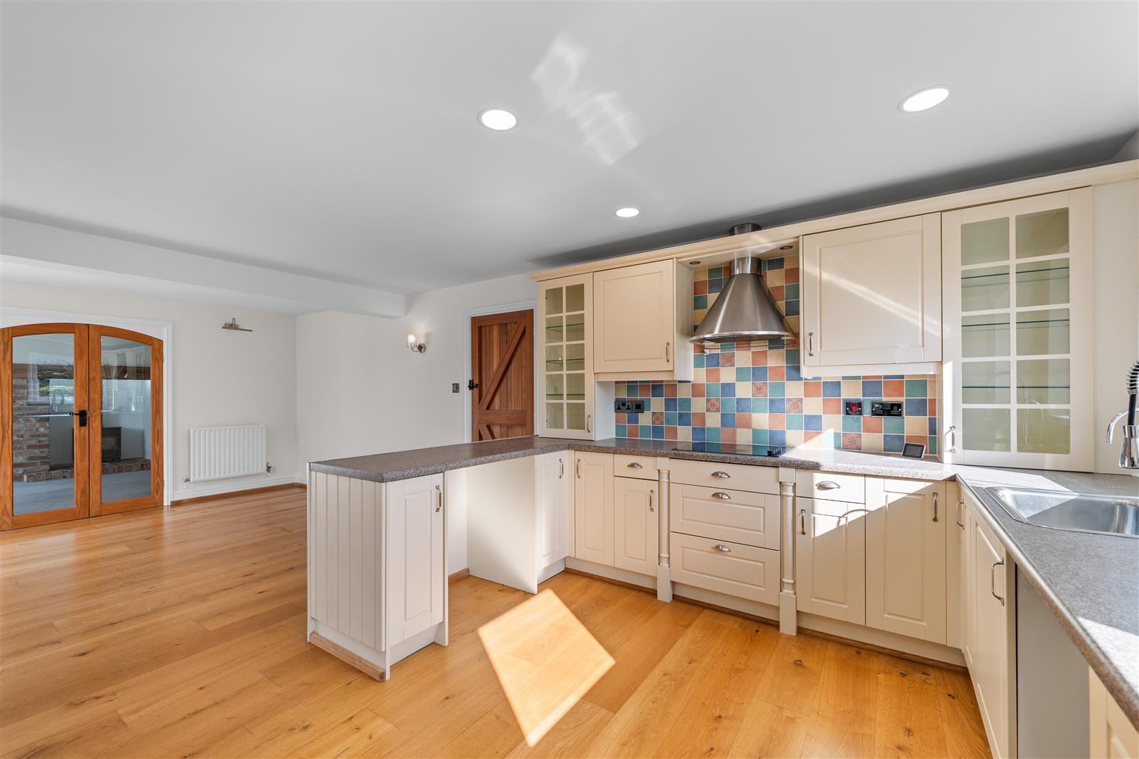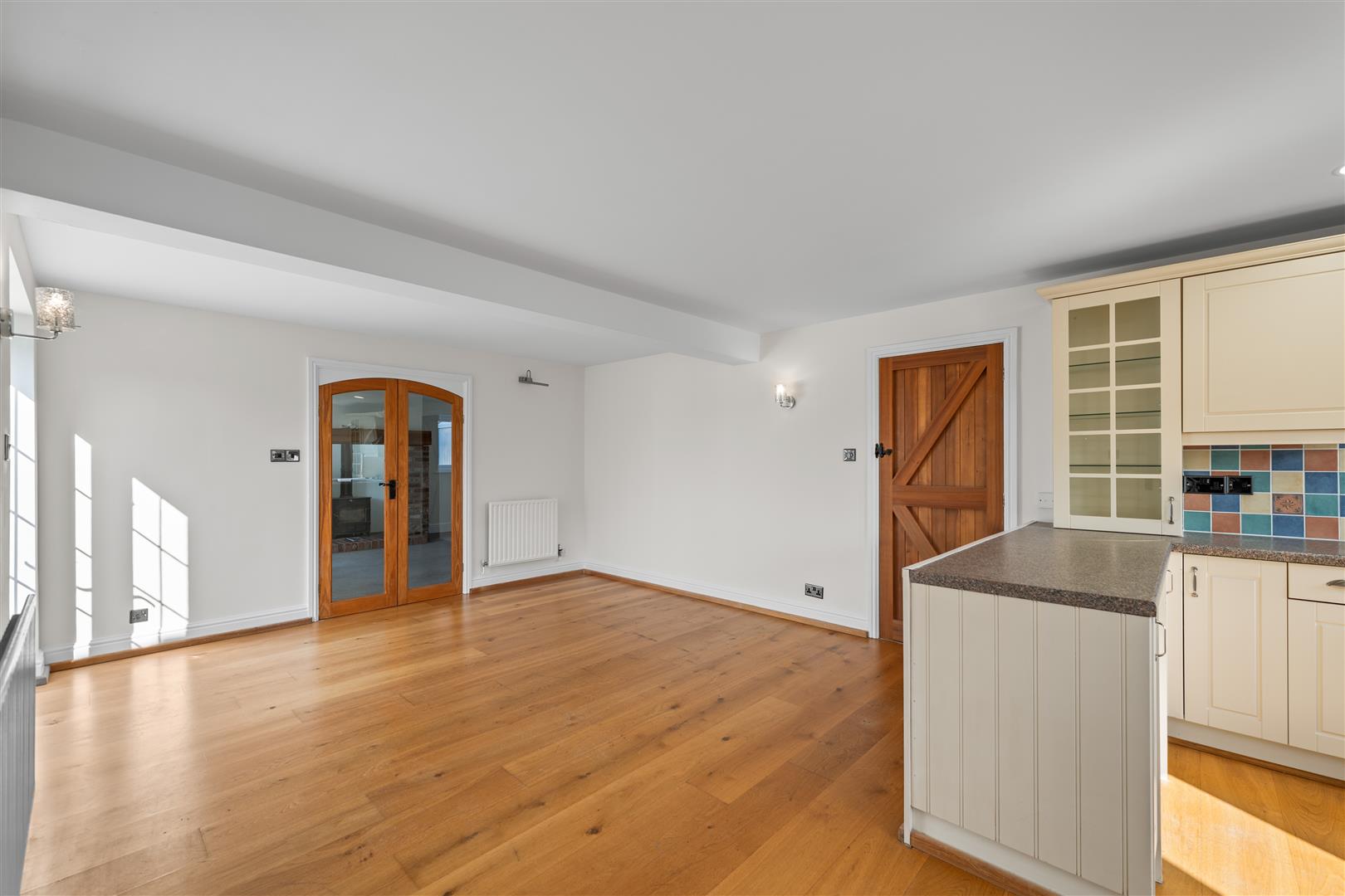 Living/Dining Kitchen - 7.47m x 4.04m (24'6" x 13'3") - A well proportioned, light and airy space having double glazed windows to the front and side as well as French doors leading out into the garden. The kitchen is large enough to accommodate both a living and dining area that is open plan to the kitchen which is fitted with a generous range of Shaker style wall, base and drawer units with glazed display cabinets and U shaped configuration of laminate preparation surfaces, having inset stainless steel sink unit with swan neck articulated mixer tap and separate filtered water tap, integrated Hotpoint electric hob and double oven, plumbing for dishwasher, space for further free standing appliances, continuation of the engineered oak flooring, two central heating radiators and further door leading through into: